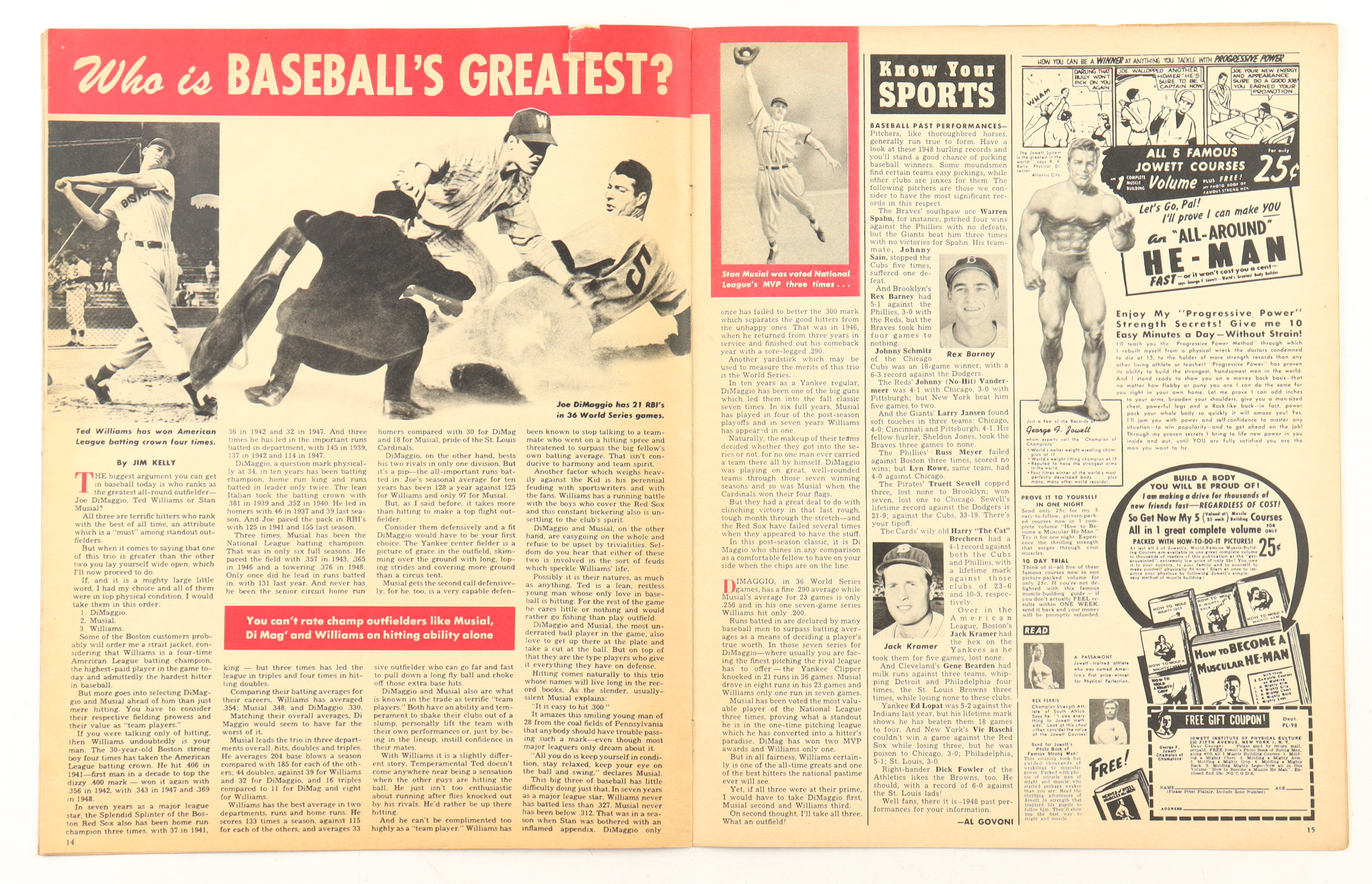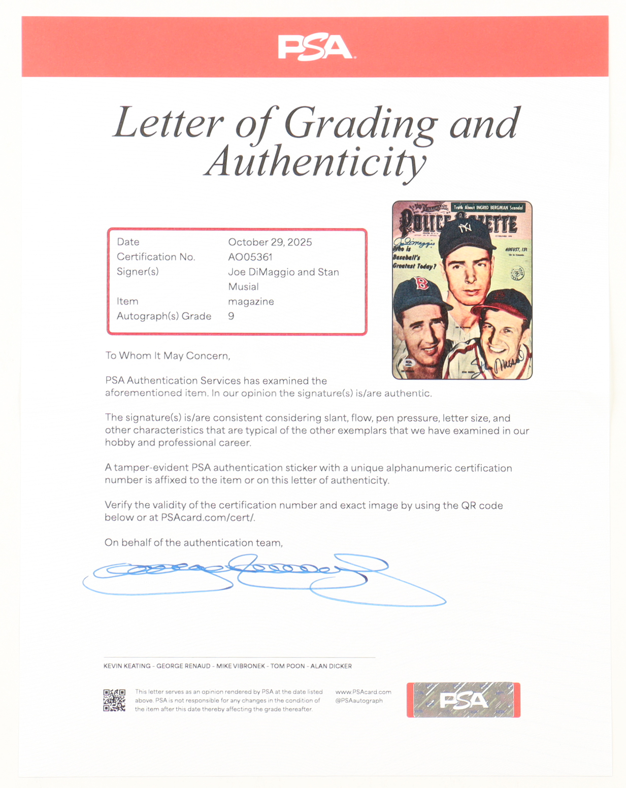 Magazine has been hand-signed by Joe DiMaggio (D. 1999, New York Yankees, HOF) & Stan Musial (D. 2013, St. Louis Cardinals, HOF). Refer to photos regarding the condition of the item.