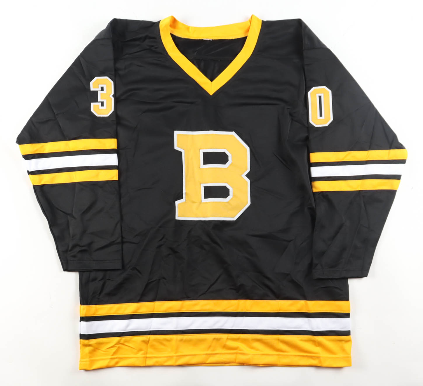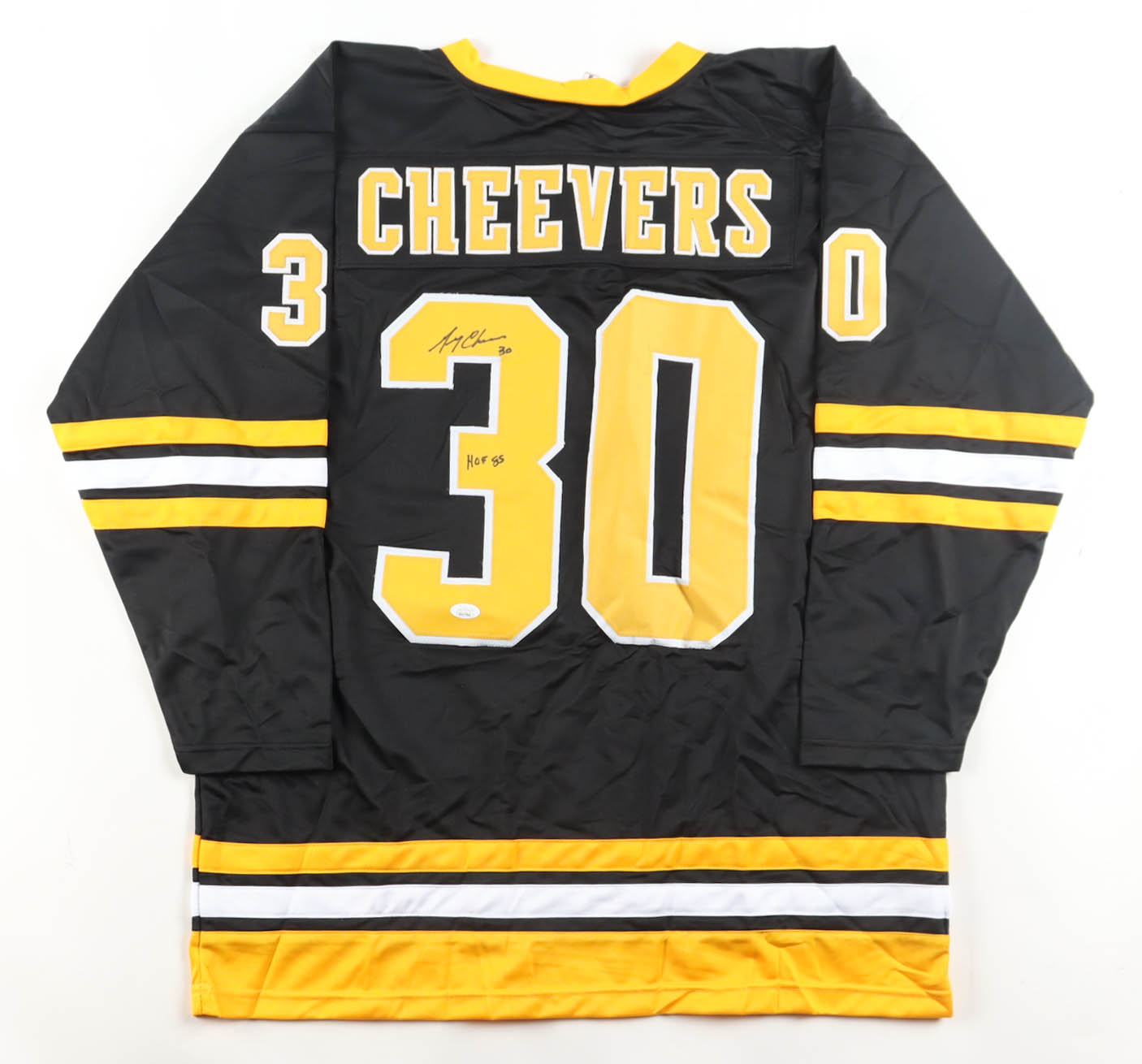 Custom jersey with everything sewn on, size XL. Hand-signed and inscribed by Gerry Cheevers (HOF).