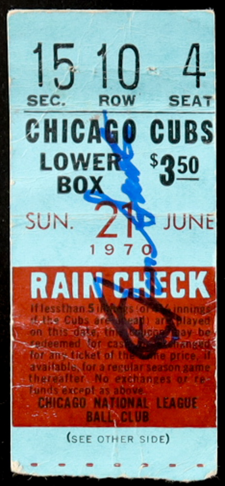 1970 game rain check dated June 21, 1970. Hand-signed by Ron Santo (D. 2010, Chicago Cubs, HOF). Please note ticket measures 1" x 3".