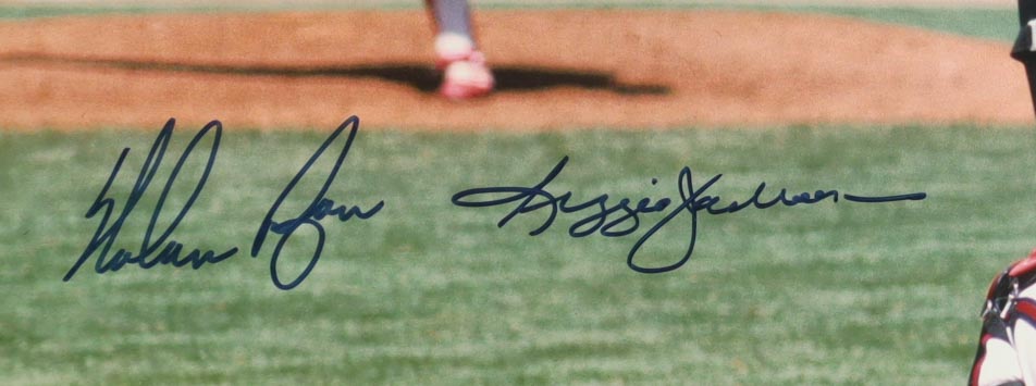 Custom frame measures approximately 28" x 30" in size. Photograph is hand-signed by Nolan Ryan (Texas Rangers, HOF) and Reggie Jackson (Oakland Athletics, HOF).
