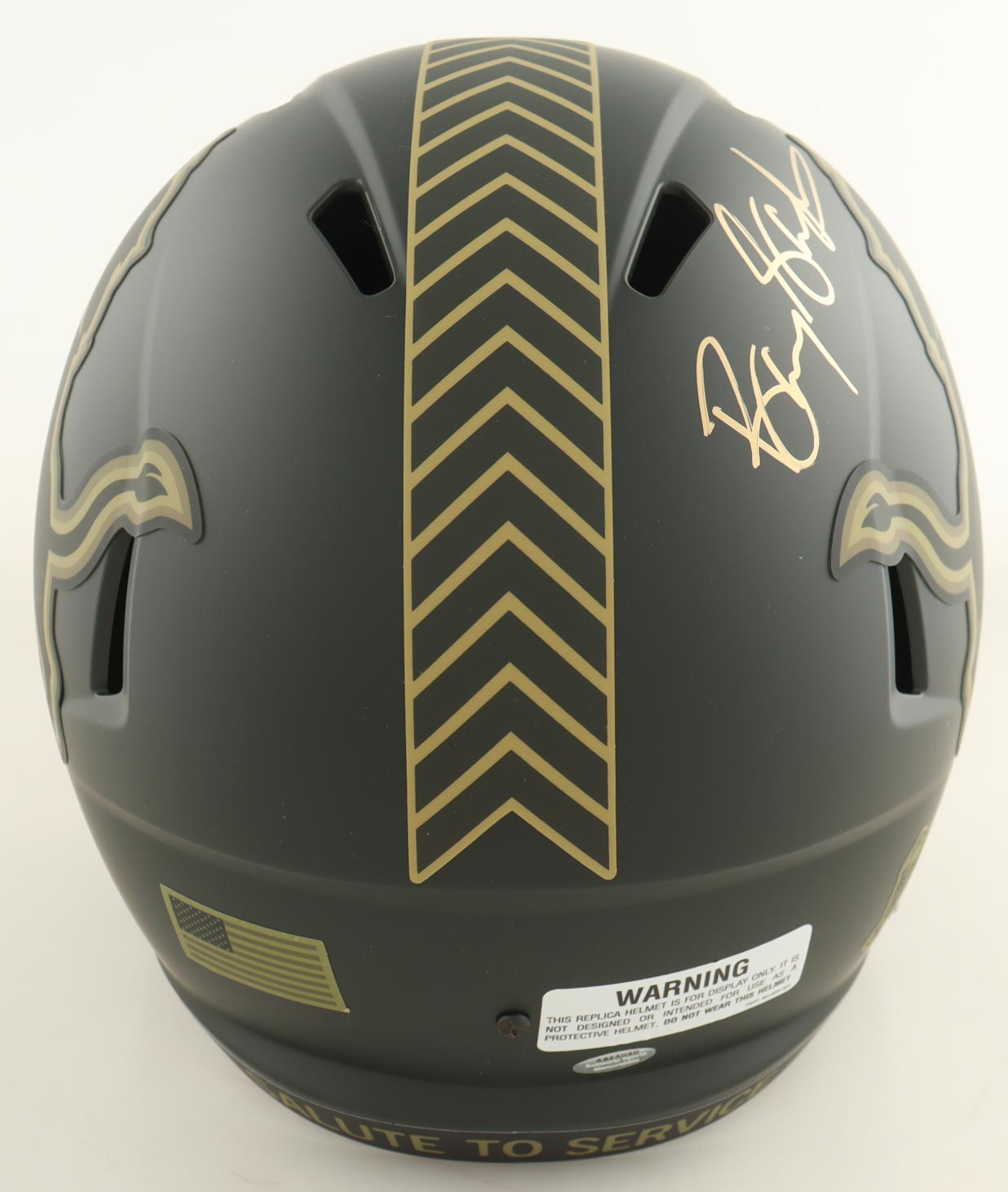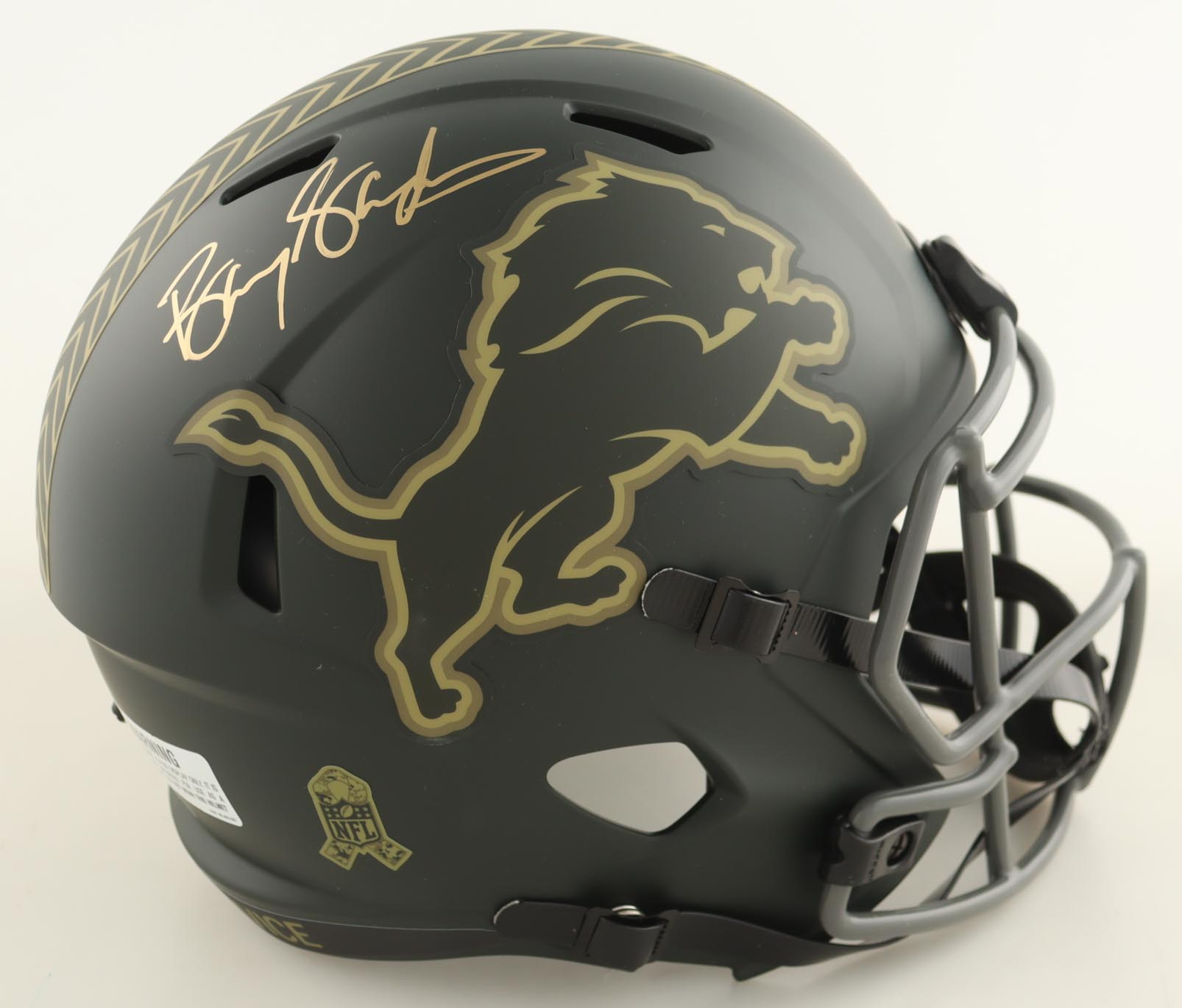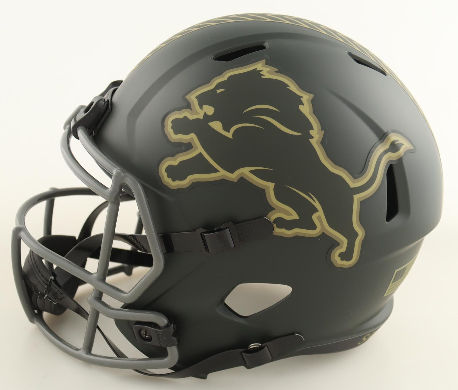 Riddell Detroit Lions full-size replica Salute to Service Alternate Speed helmet has been hand-signed by Barry Sanders (HOF).