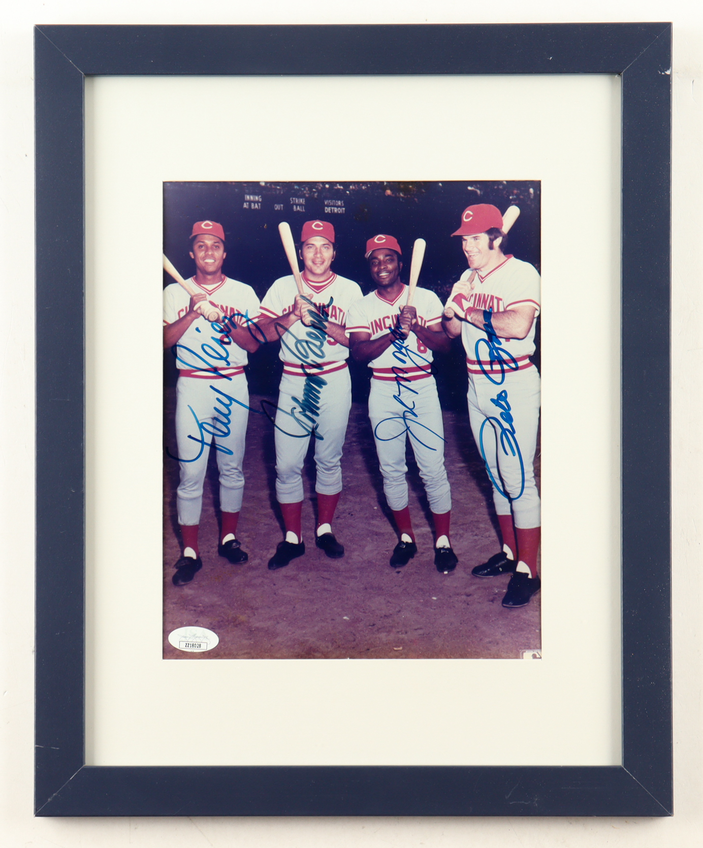 Custom plaque measures approximately 12" x 15" in size. Photograph has been hand-signed by Pete Rose, Johnny Bench, Tony Perez, and Joe Morgan. Please note, there is scuffing on the frame - see photo for more detail.