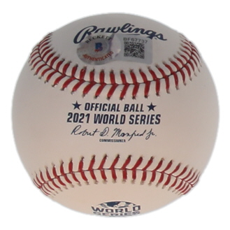Rawlings Official 2021 World Series logo baseball. Hand-signed and inscribed by AJ Minter (Atlanta Braves).