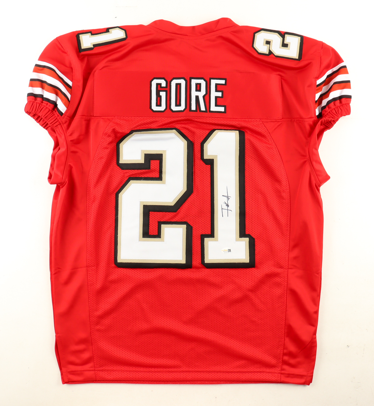 Custom jersey with everything sewn on, size XL. Hand-signed by Frank Gore.