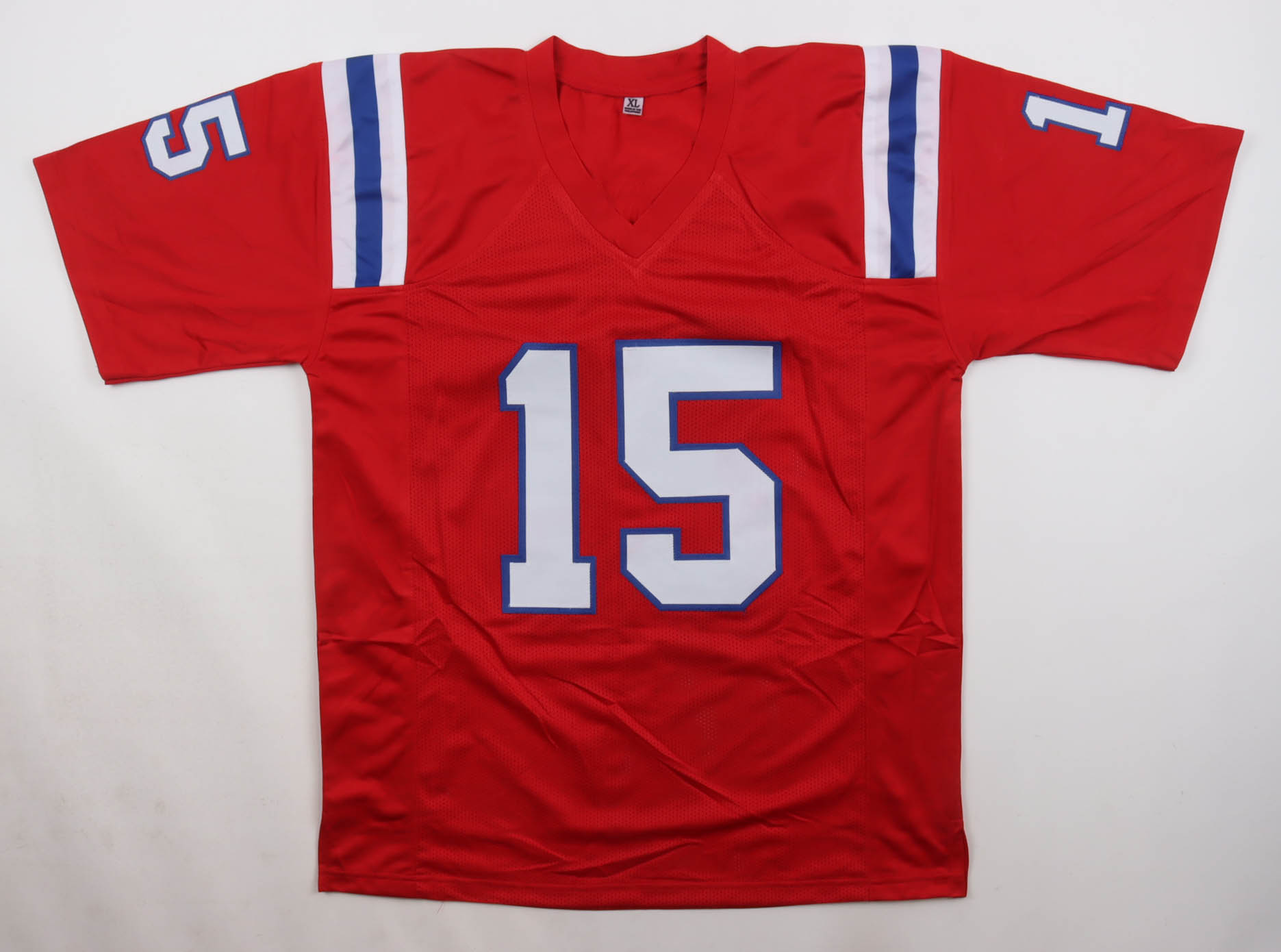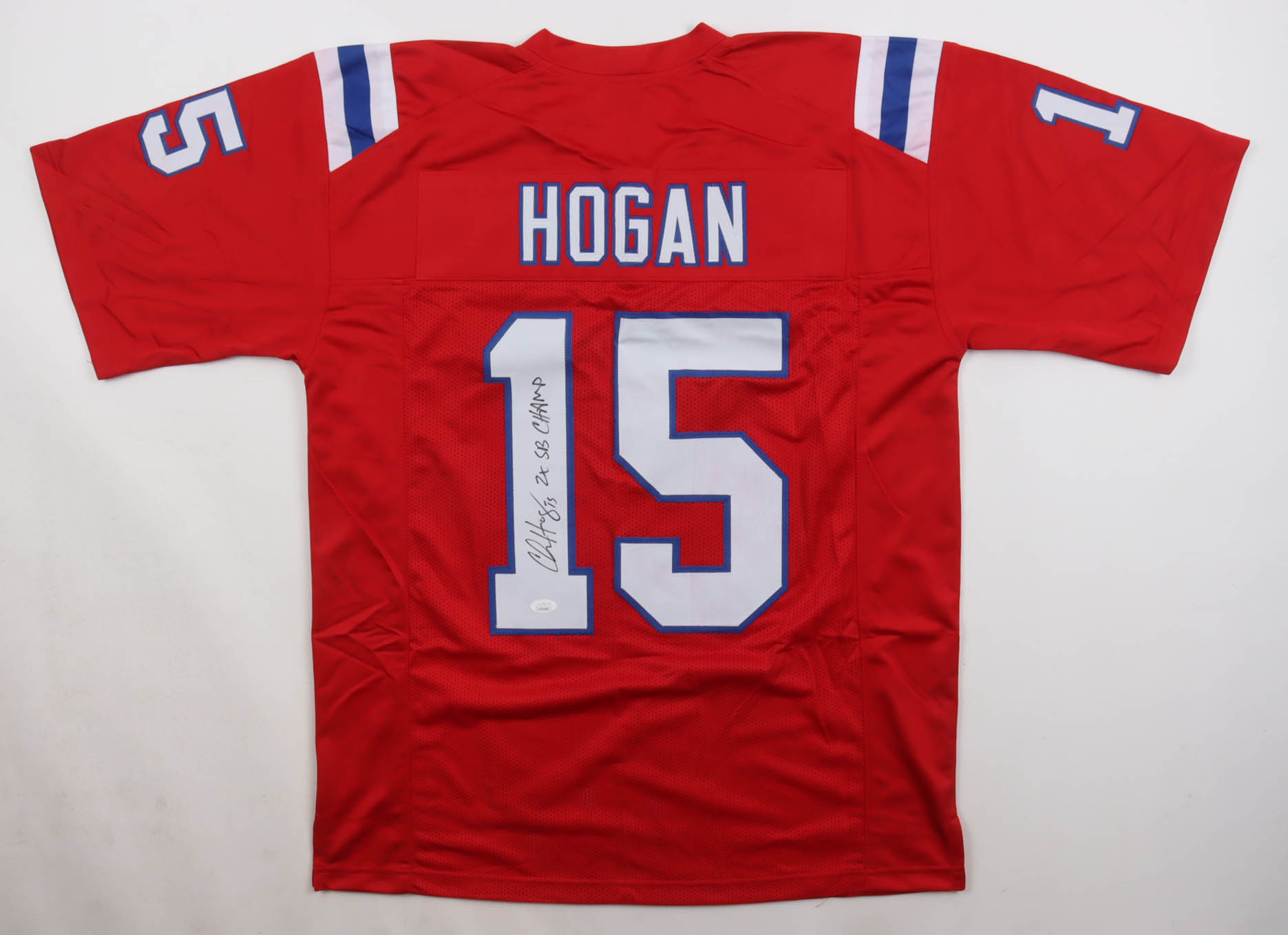 Custom jersey with everything sewn on, size XL. Hand-signed and inscribed by Chris Hogan. Please note, there is red staining on the reverse number.