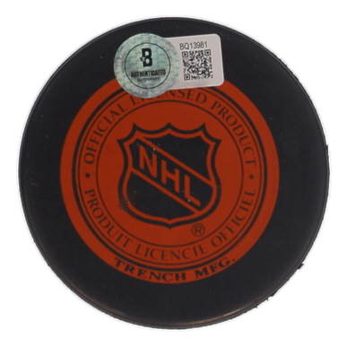 Montreal Canadiens logo hockey puck has been hand-signed by Jean Beliveau (D. 2014, HOF).