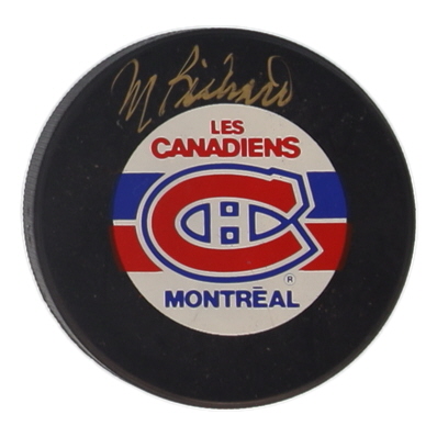 Montreal Canadiens logo hockey puck has been hand-signed by Maurice Richard (D. 2000, HOF).