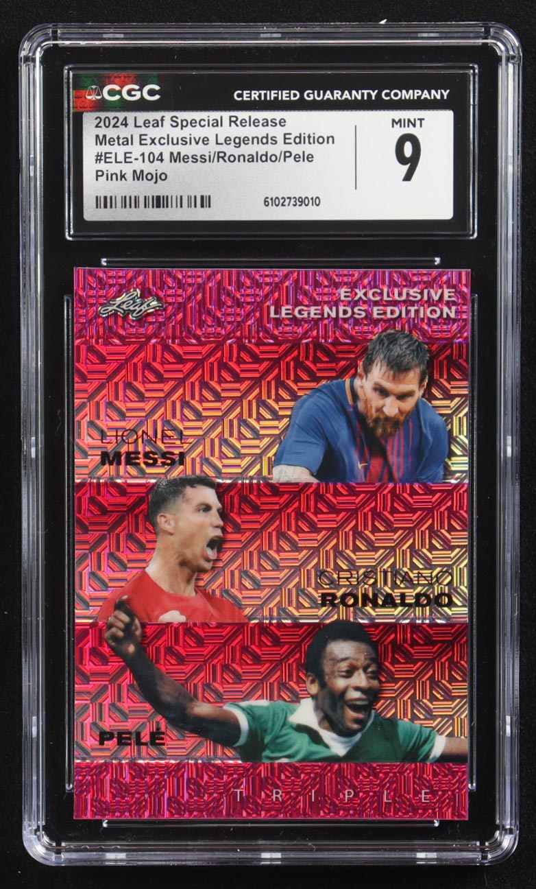 Pele / Lionel Messi / Cristiano Ronaldo 2024 Leaf Special Release Metal Exclusive Legends Edition Pink Mojo Triple #ELE-104 #3/10 (CGC 9)