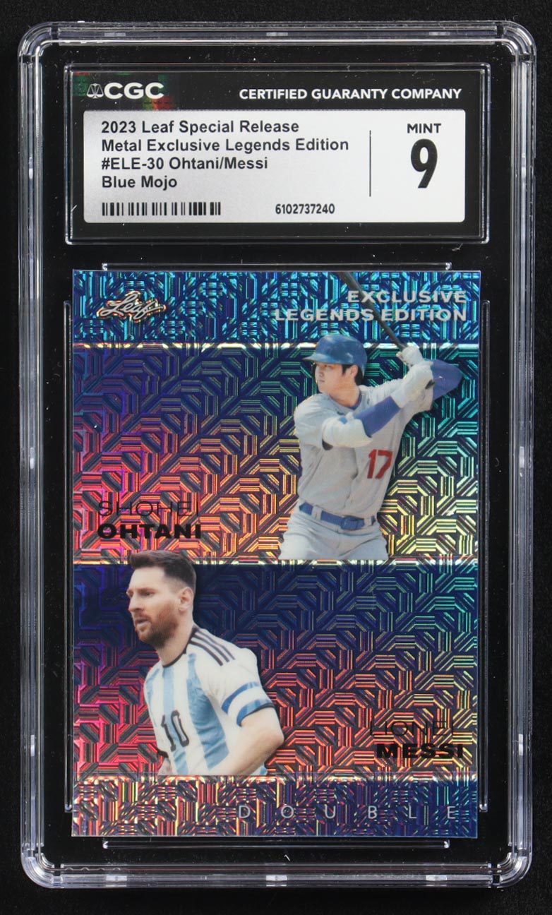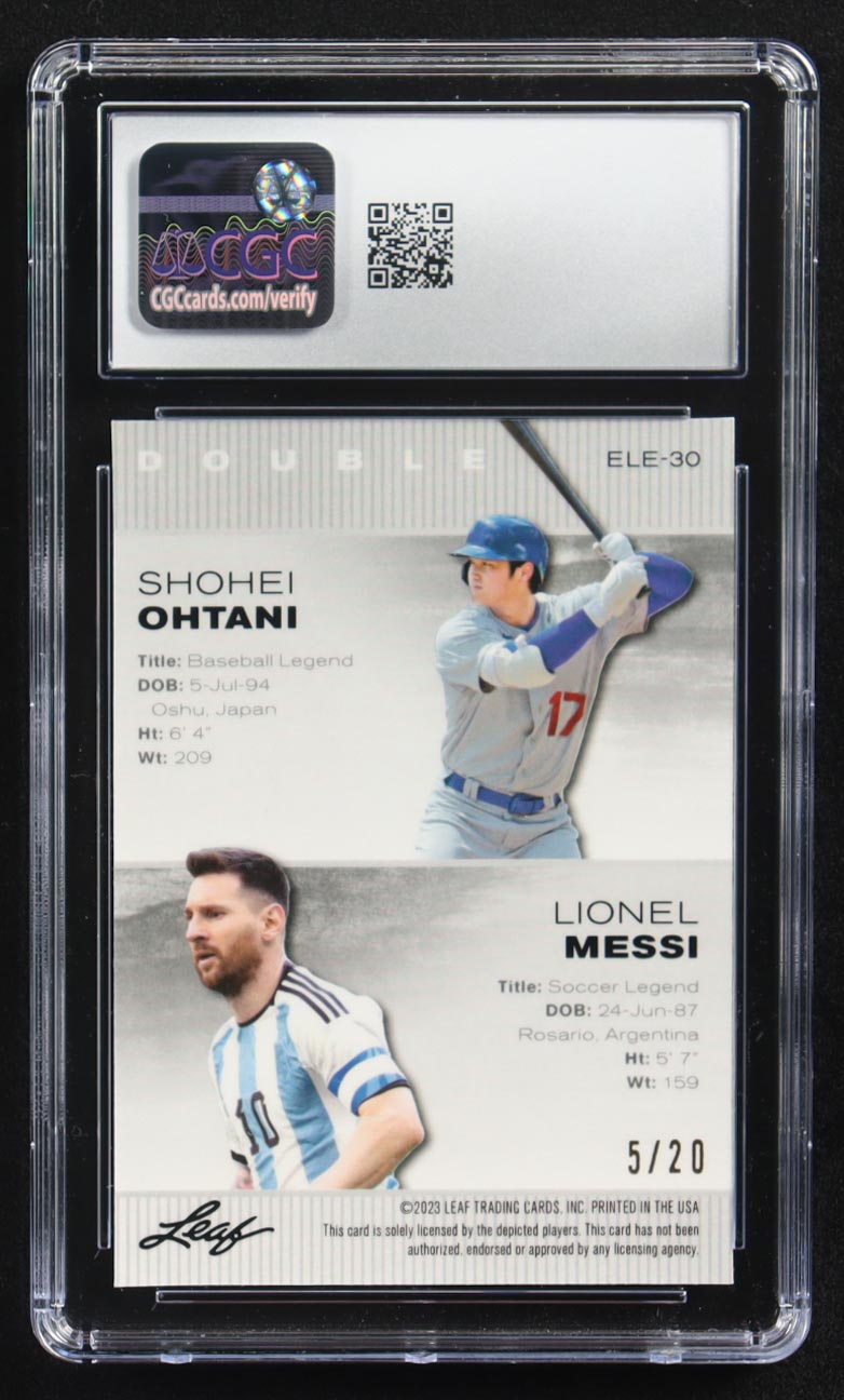 Lionel Messi / Shohei Ohtani 2023 Leaf Special Release Metal Exclusive Legends Edition Blue Mojo Double #ELE-30 #5/20 (CGC 9)