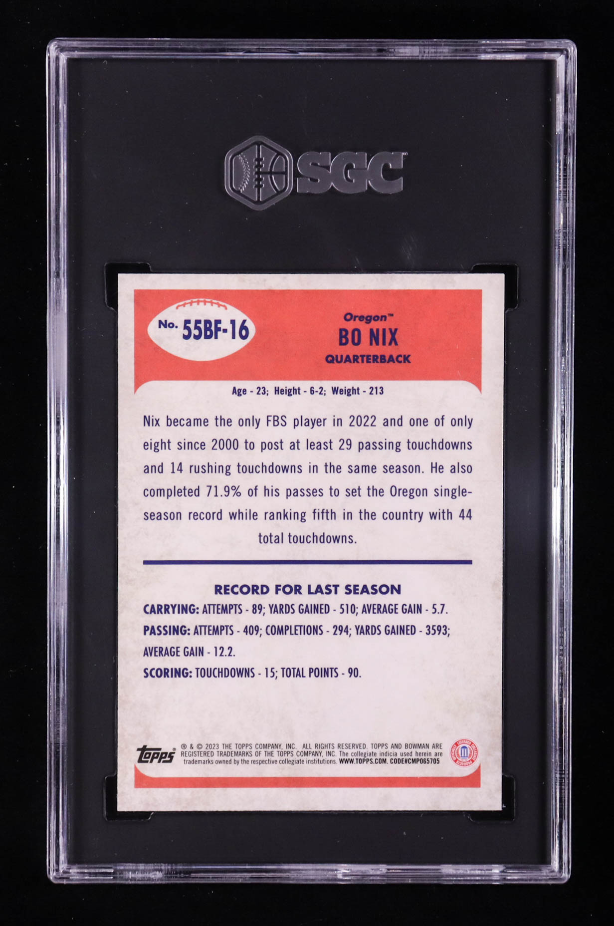 Bo Nix 2023 Bowman Chrome University '55 Bowman #55BF16 RC (SGC 10)