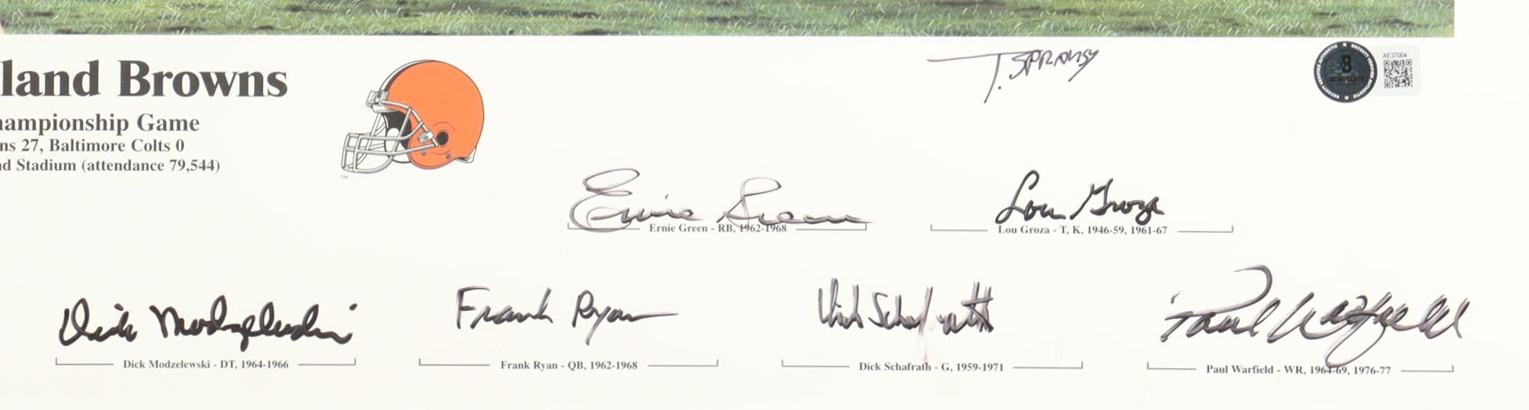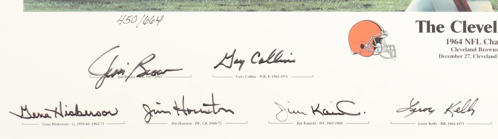 Custom frame measures approximately 28" x 34" in size and features a cut that has been hand-signed by (13) with Jim Brown, Gene Hickerson, Leroy Kelly, Lou Groza, Paul Warfield, Gary Collins, Frank Ryan, Dick Modzelewski, Jim Houston, Ernie Green, Jim Kanicki, Dick Schafrath and artist Tim Spansy. Please see photos for details regarding the item. Note that the frame shows signs of slight damage.