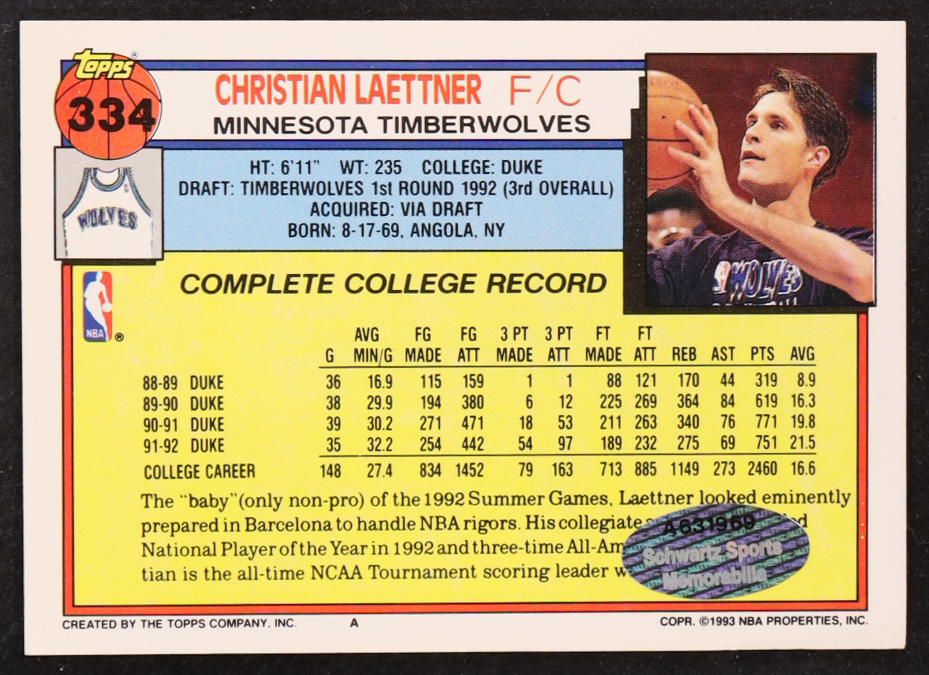 Christian Laettner Signed 1992-93 Topps #334 RC (Schwartz)