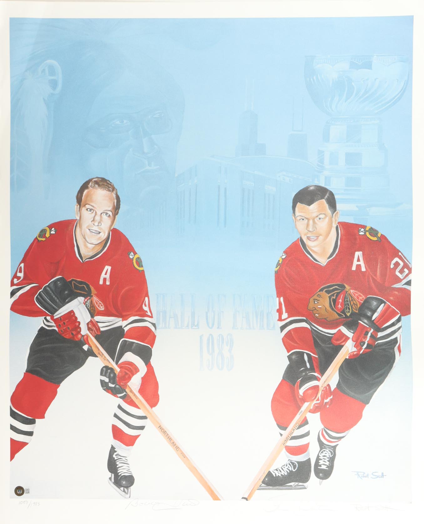 Bobby Hull & Stan Mikitia Signed Blackhawks LE Custom Lithograph #/1983 (Beckett)