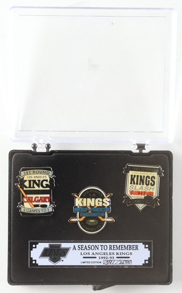 1992-39 Los Angeles Kings "A Season To Remember" commemorative pin set includes (3) pins and display case as shown. Pin set is limited edition and has been numbered #1,591/2,500. Please note, the pin set is unsigned.
