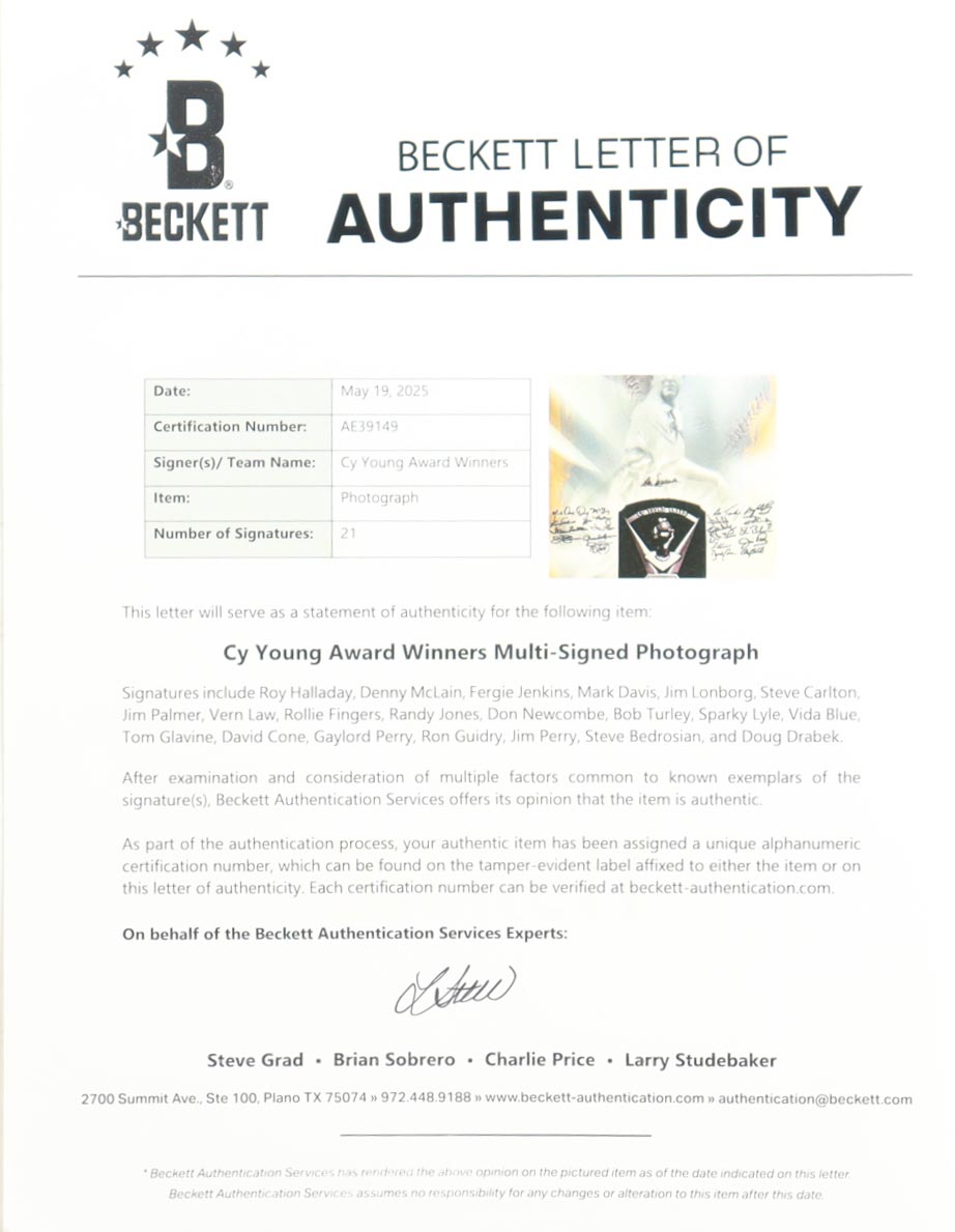 Lithograph measures approximately 26" x 32" in size and features a lithograph that has been hand-signed by (21) with Roy Halladay, Denny McLain, Fergie Jenkins, Mark Davis, Jim Lonborg, Steve Carlton, Jim Palmer, Vern Law, Rollie Fingers, Randy Jones, Don Newcombe, Bob Turley, Sparkly Lyle, Vida Blue, Tom Glavine, David Cone, Garylord Perry, Ron Guidry, Jim Perry, Steve Bedrosian and Doug Drabek. Please see photos for details regarding the item. Note that the frame shows signs of slight damage.