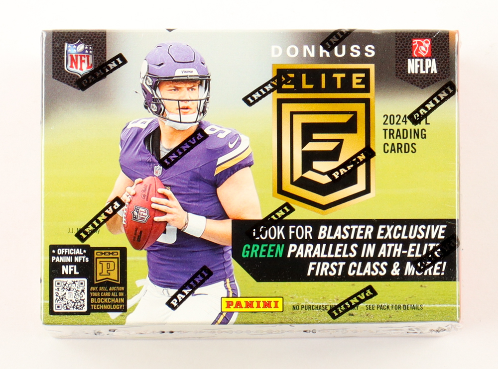 The fabled Donruss Elite Football franchise returns for the 2024 NFL season locked and loaded with a 200-card base set, featuring a captivating base aesthetic and 100 Rookie Cards, paralleled by the venerable Aspirations and Status chases. Find 1 Blaster Exclusive Aspirations Shimmer or Status Explosion! Look for Blaster Exclusive Green Disco Parallels!