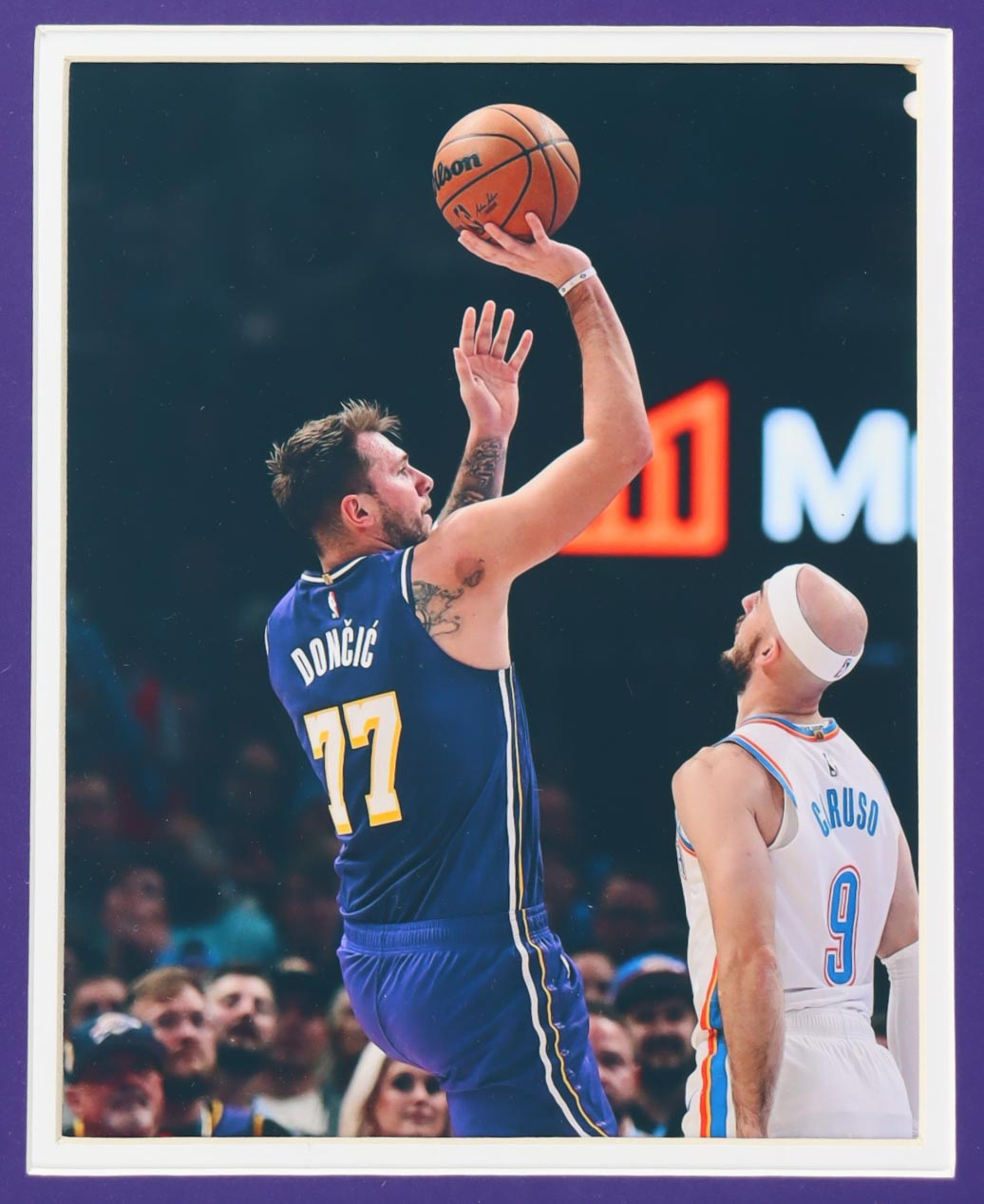 Custom frame measures approximately 32.5" x 39.5" in size and features an authentic jersey that has been hand-signed by Luka Doncic. Display also includes (2) 8" x 10" photos.