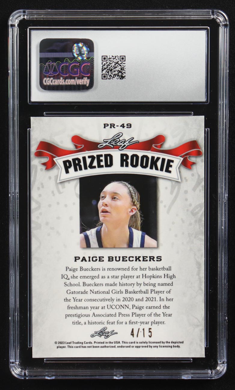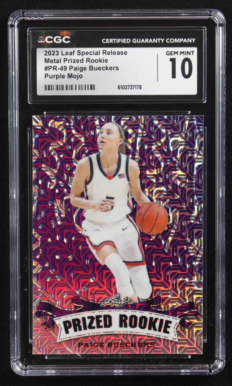 Paige Bueckers 2023 Leaf Special Release Metal Prized Rookie Purple Mojo #PR-49 RC #4/15 (CGC 10)