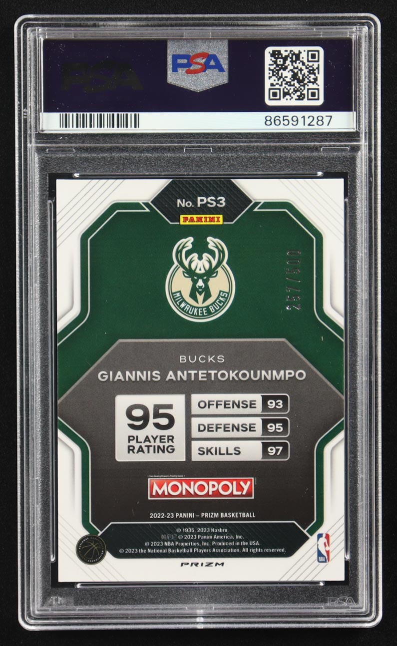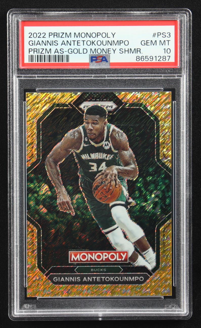 Giannis Antetokounmpo 2022-23 Panini Prizm Monopoly All-Stars Gold Money Shimmer #PS3 #257/500 (PSA 10)
