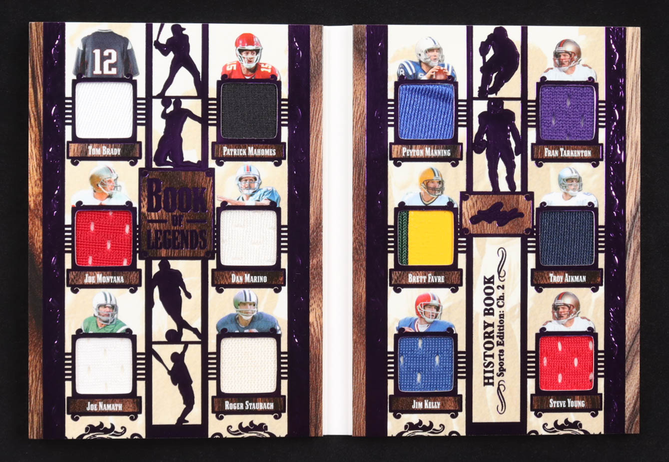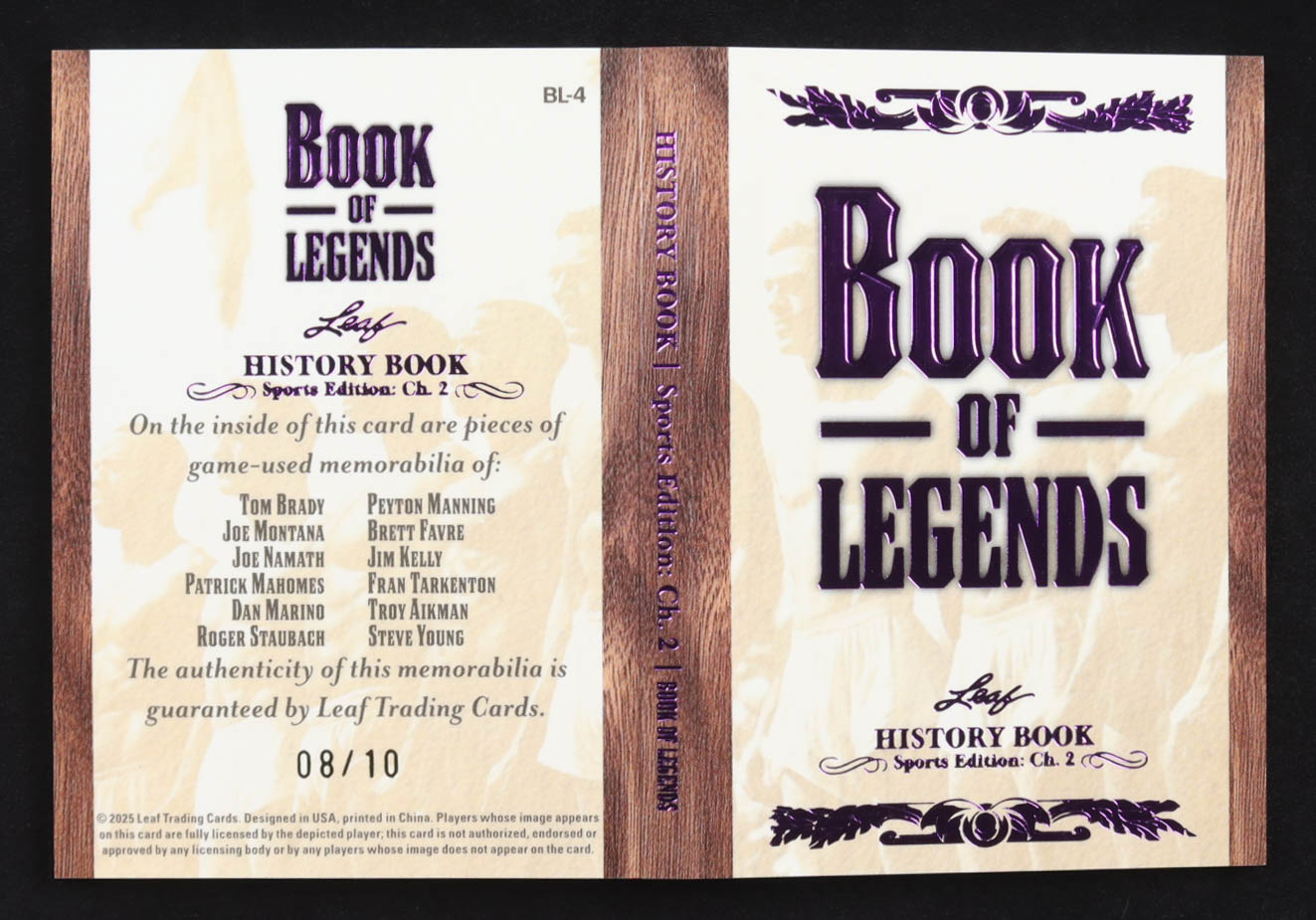 Tom Brady / Joe Montana / Joe Namath / Patrick Mahomes / Dan Marino / Roger Staubach / Peyton Manning / Brett Favre / Jim Kelly / Fran Tarkenton / Troy Aikman / Steve Young 2025 Leaf History Book Book of Legends Purple #BL4 #8/10