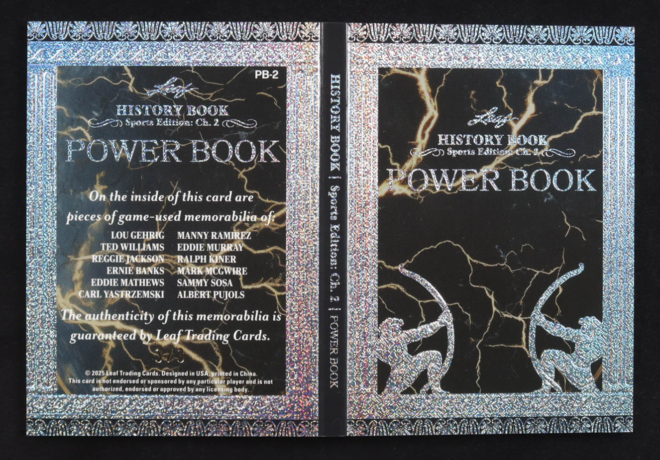 Lou Gehrig / Ted Williams / Reggie Jackson / Ernie Banks / Eddie Mathews / Carl Yastrzemski / Manny Ramirez / Eddie Murray / Ralph Kiner / Mark McGwire / Sammy Sosa / Albert Pujols 2025 Leaf History Book Power Book Silver #PB2 #3/3