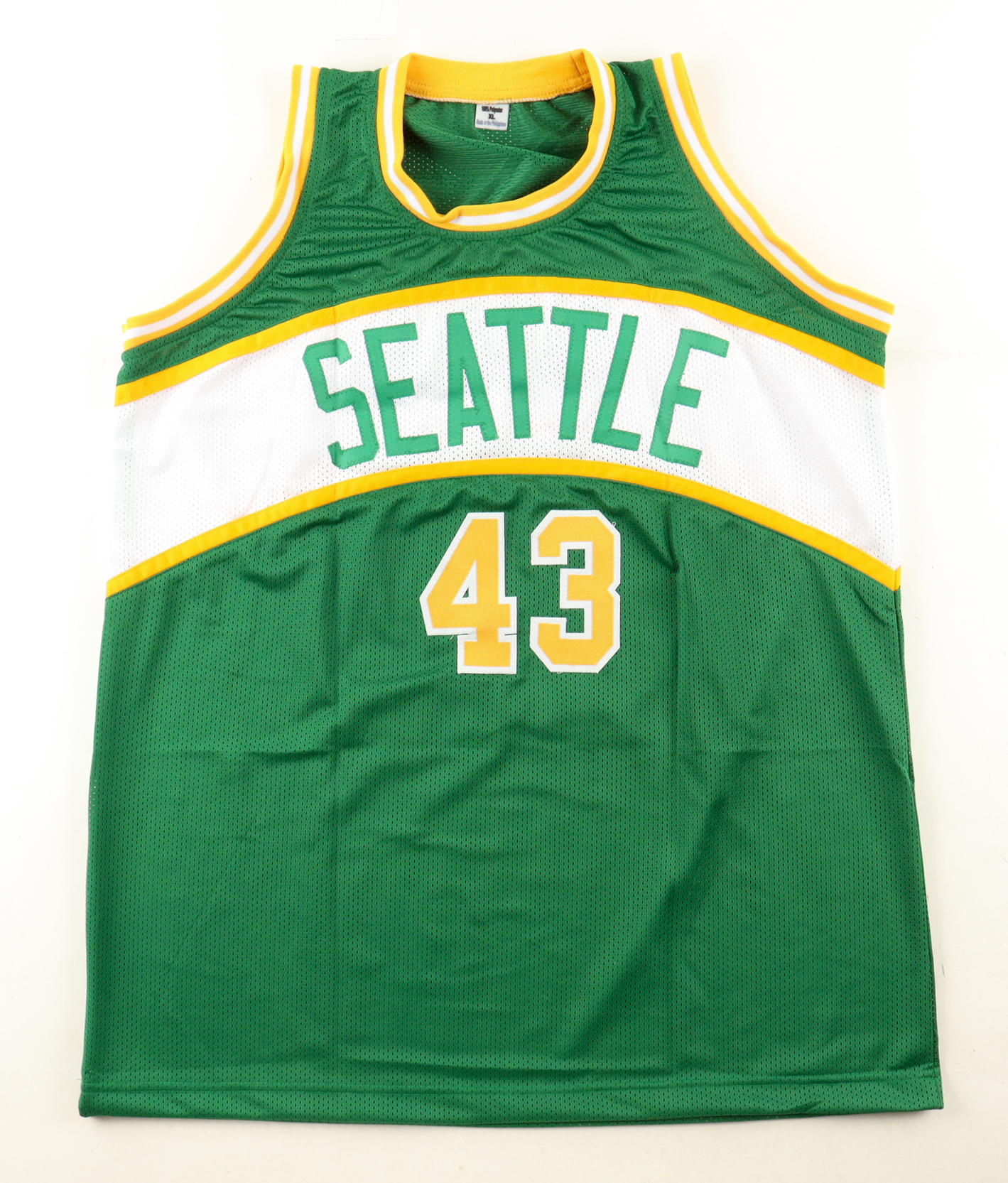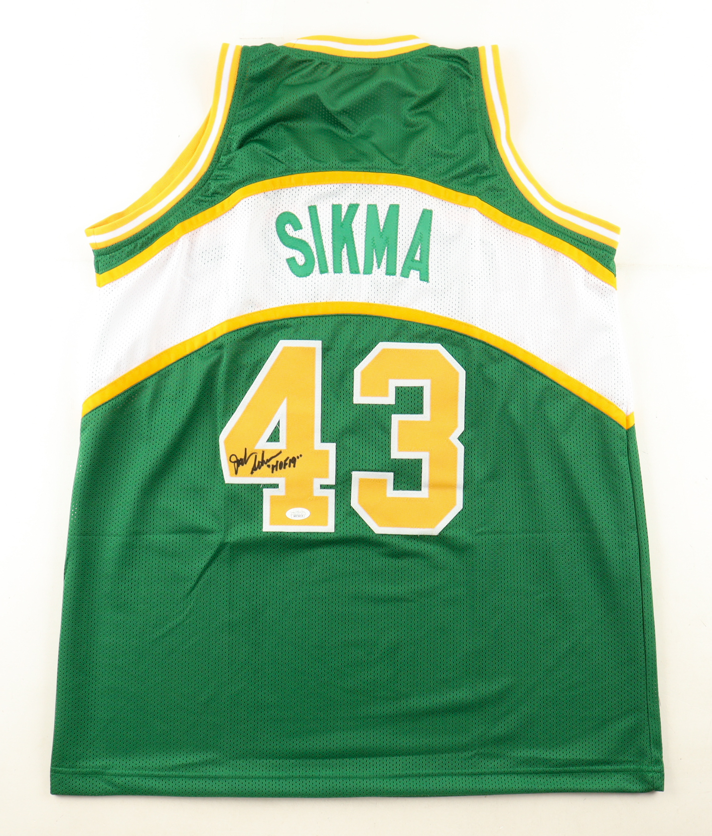 Custom jersey. Everything sewn on, size XL. Hand-signed and inscribed by Jack Sikma (HOF).