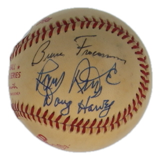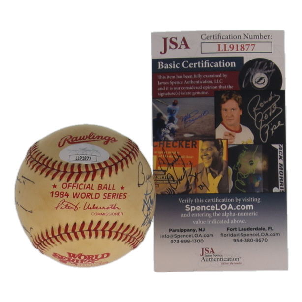 Rawlings Official 1984 World Series logo baseball has been hand-signed by Doug Harvey, Bruce Froemming, Paul Runge, Rich Garcia, Larry Barnett, and Mike Reilly. Please note, several signatures are fading and the baseball is naturally toned and stained.