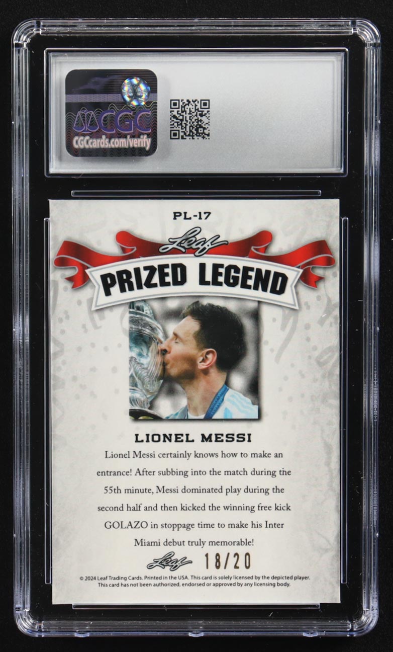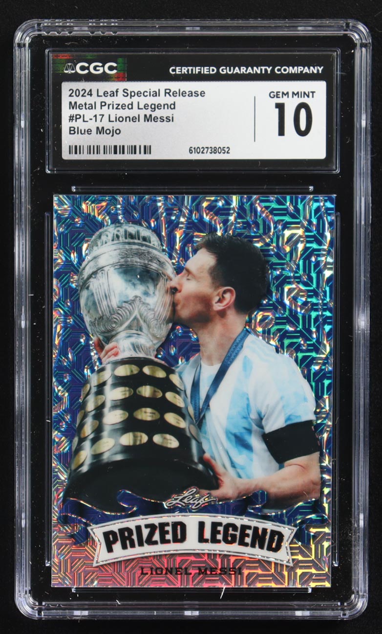 Lionel Messi 2024 Leaf Special Release Metal Prized Legend Blue Mojo #PL-17 #18/20 (CGC 10)