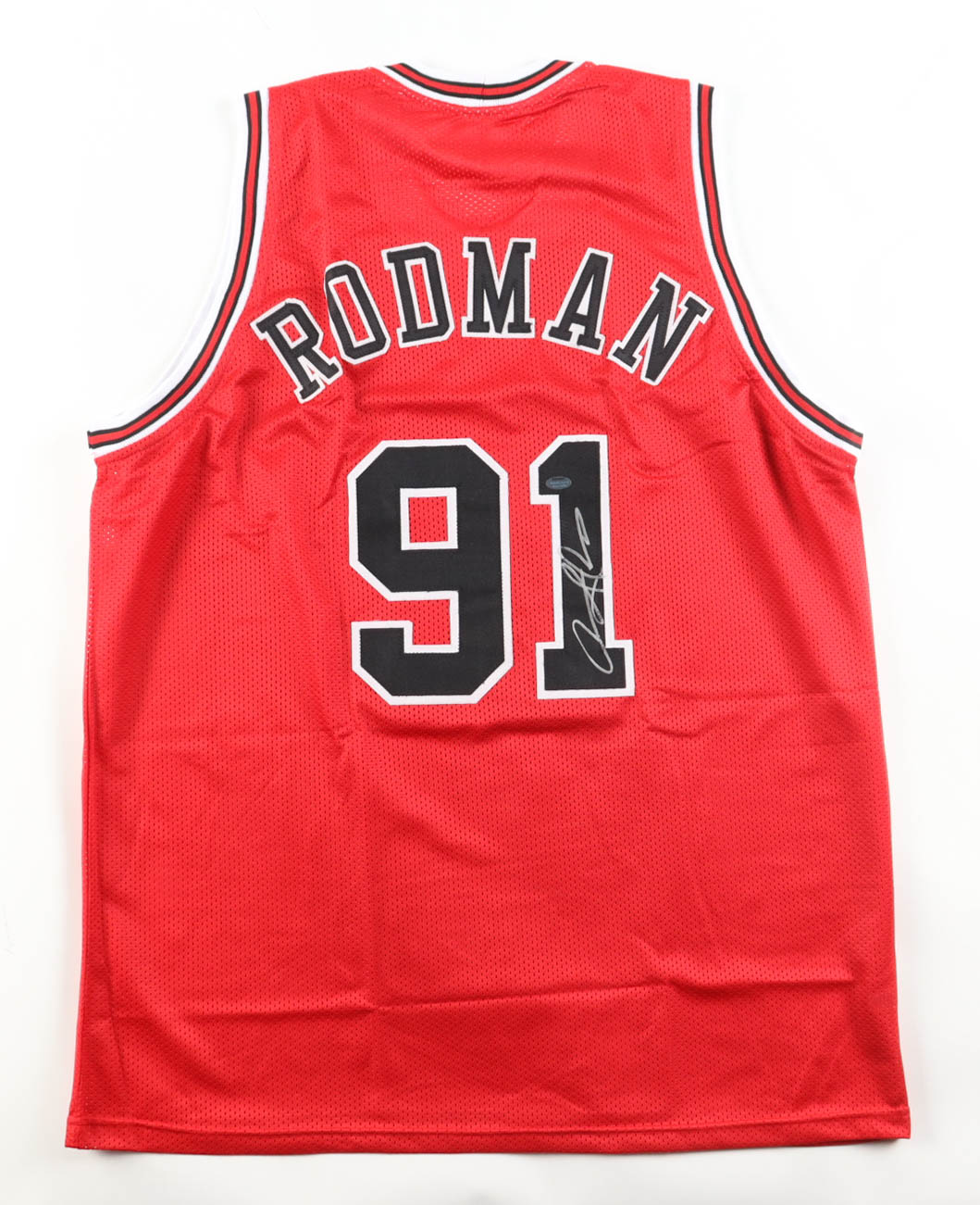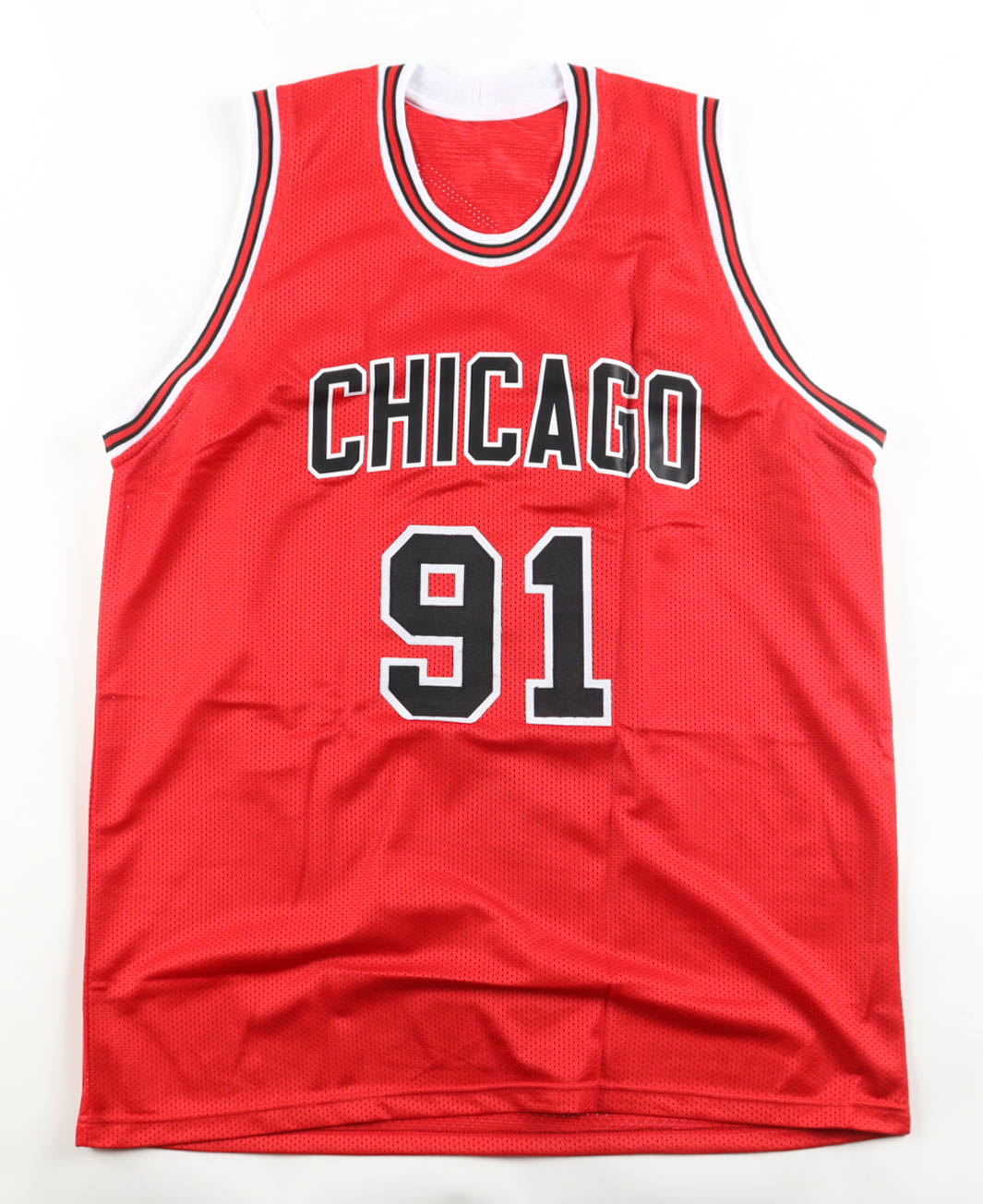 Custom jersey with everything sewn on, size XL. Hand-signed by Dennis Rodman (HOF).