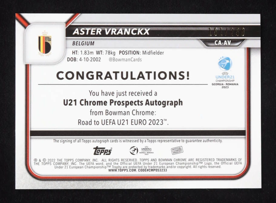 Aster Vranckx 2022 Bowman Chrome Road to UEFA U21 Euro '23 Autographs Purple Refractors #CAAV #151/250 RC