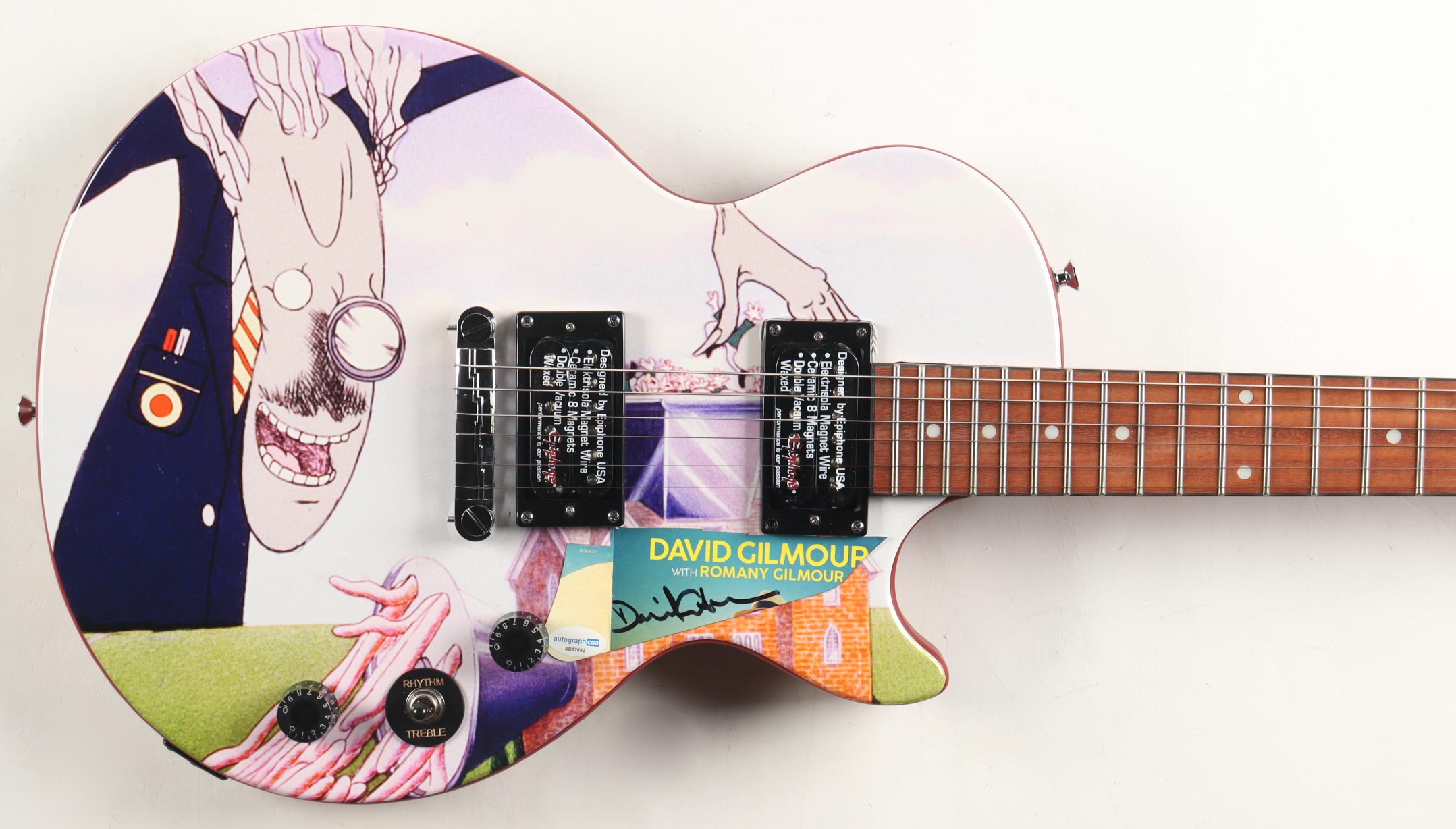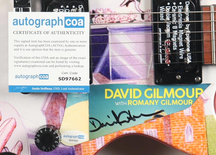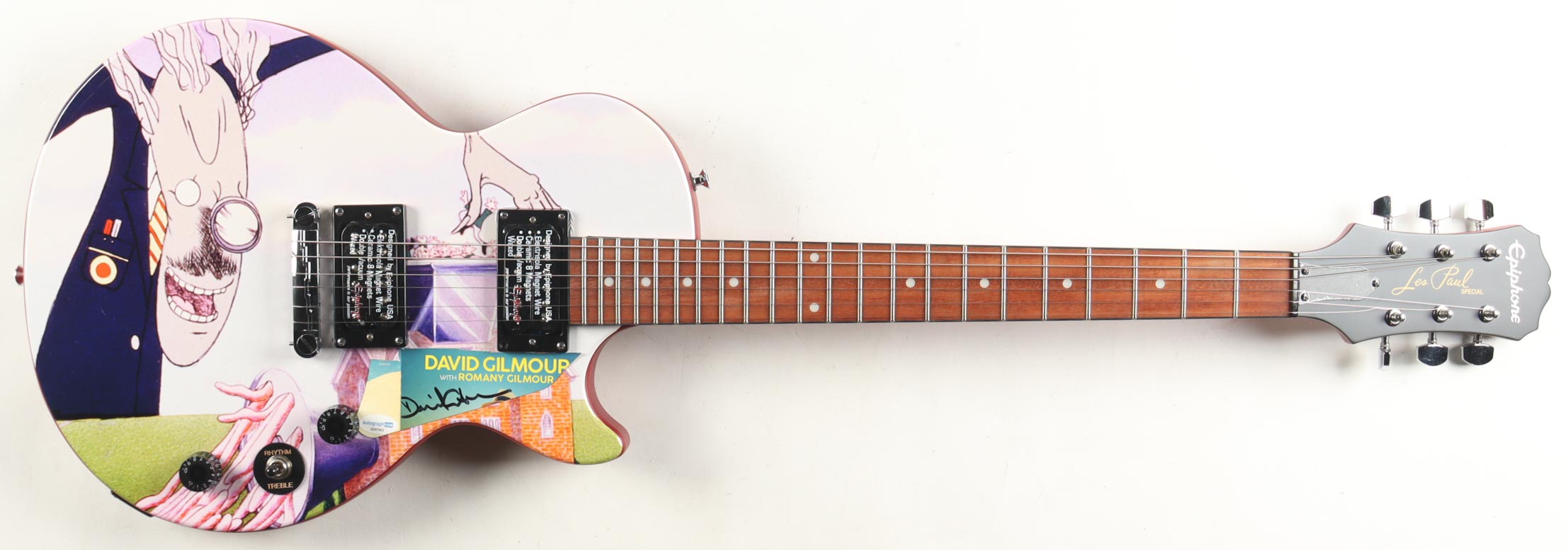 39" Epiphone Les Paul Special electric guitar has been hand-signed on a makeshift pickguard of an album insert by David Gilmour (Lead Guitarist).