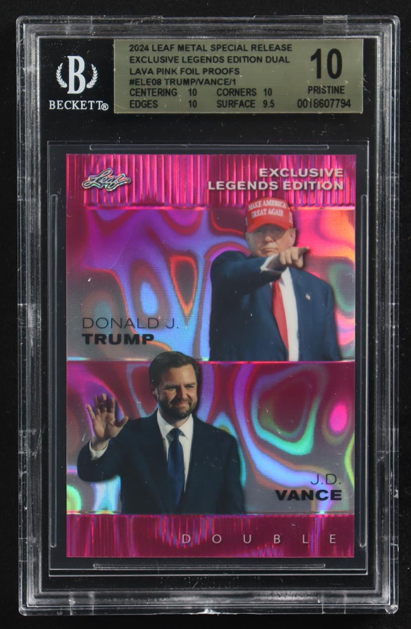 J.D. Vance / Donald J. Trump 2024 Leaf Metal Special Release Exclusive Legends Ed. Dual Lava Pink Foil Proofs #ELE08 (BGS 10)