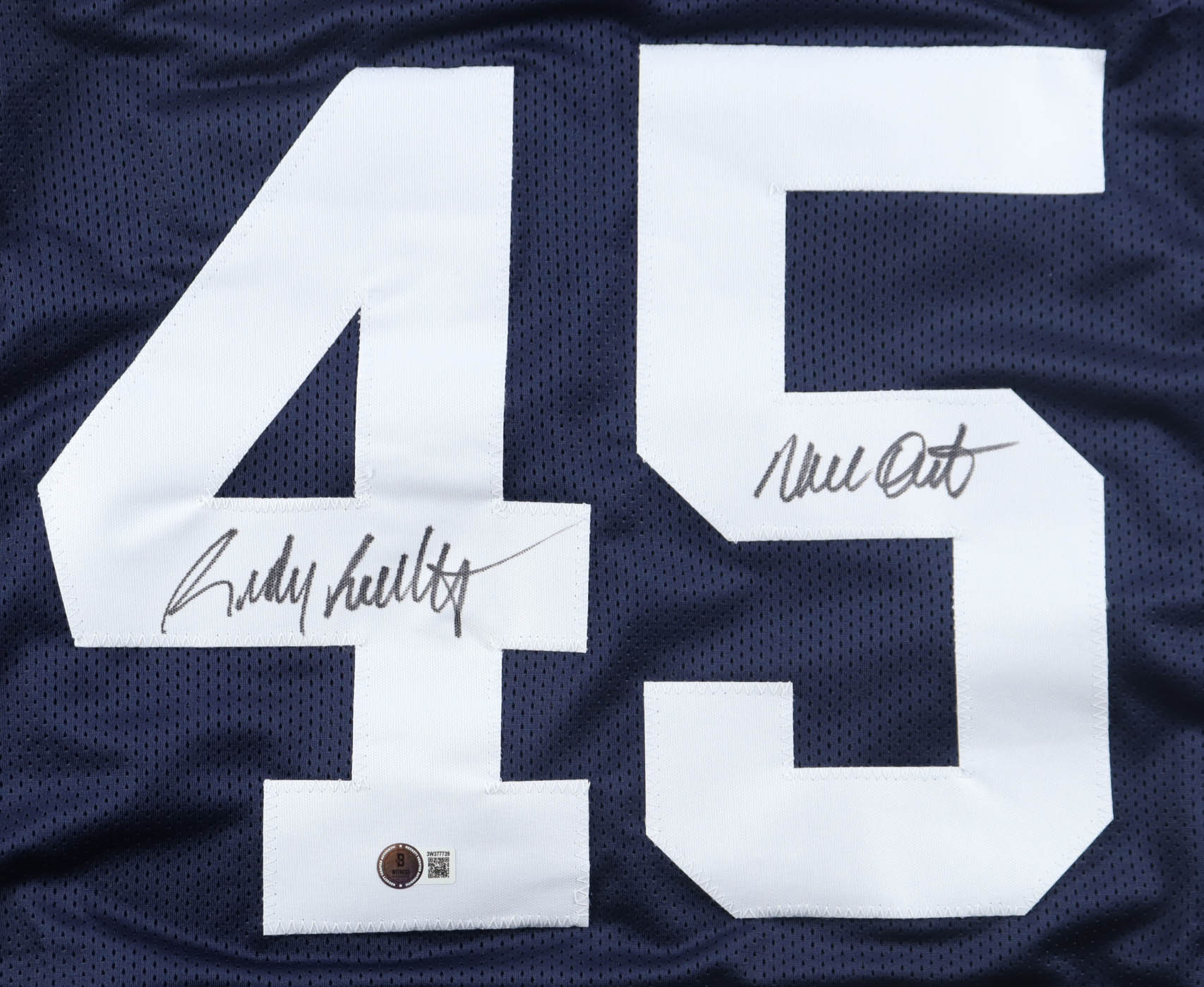Custom jersey with everything sewn on, size XL. Hand-signed and inscribed by Rudy Ruettiger (Notre Dame Fighting Irish). Please note, a quote from the movie "Rudy" has been custom-stitched below the reverse numbers.