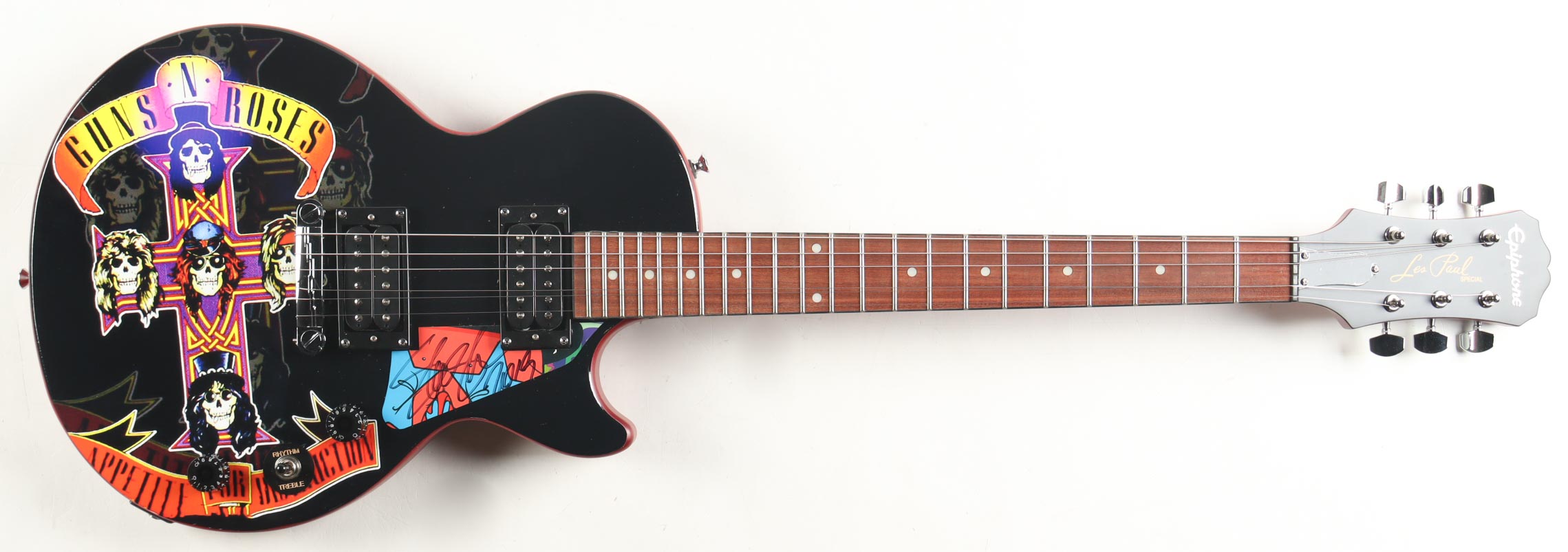 Guns N' Roses Les Paul Special Epiphone Electric guitar measures approximately 41" in length and has been hand-signed on the CD cover, repurposed as a pickguard, by Slash.