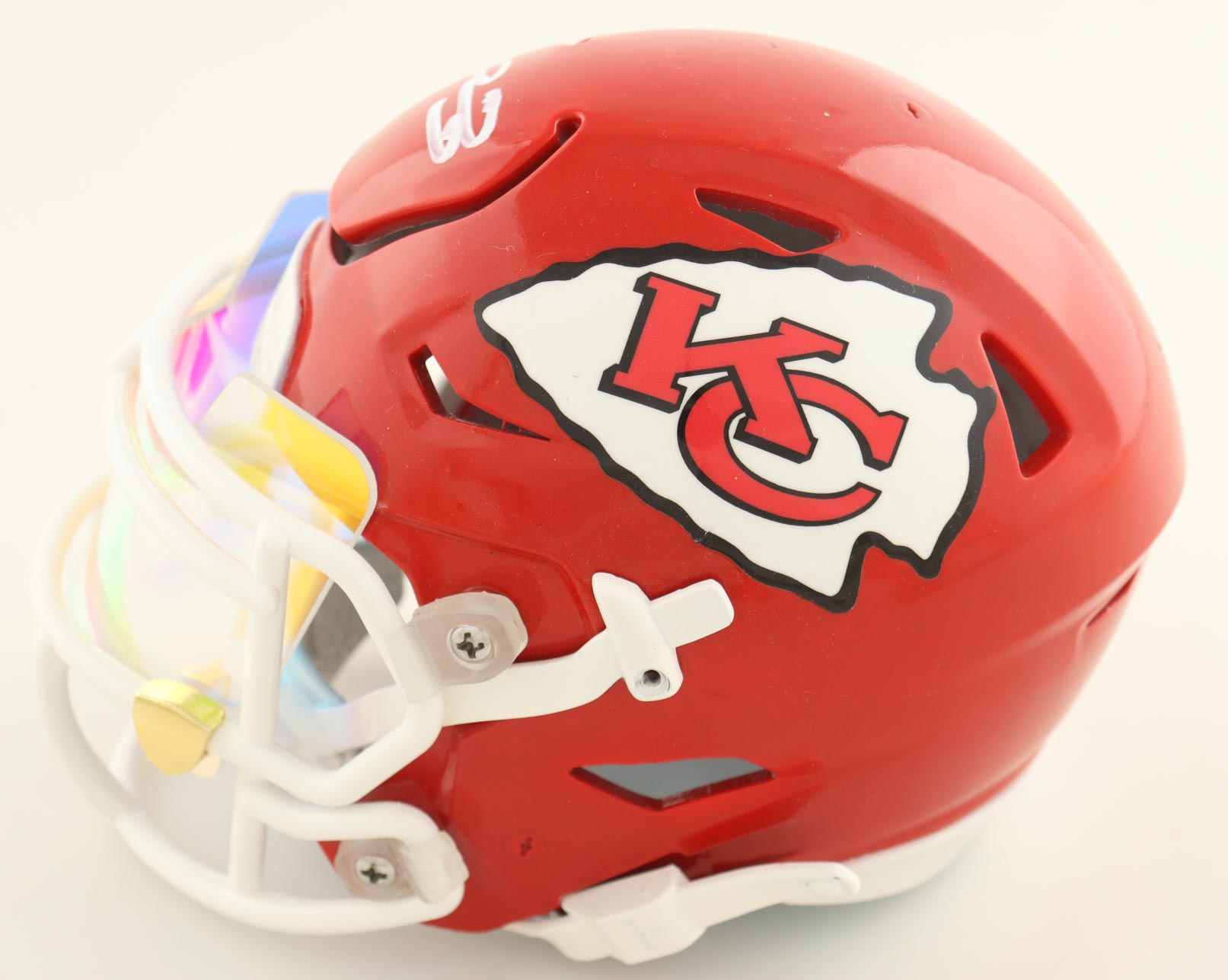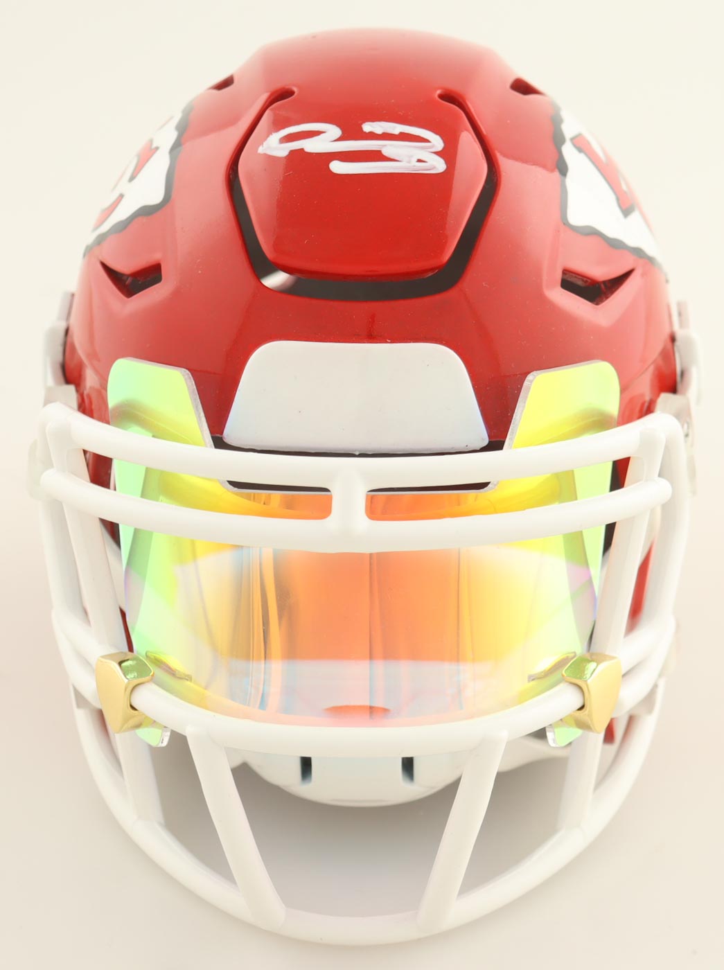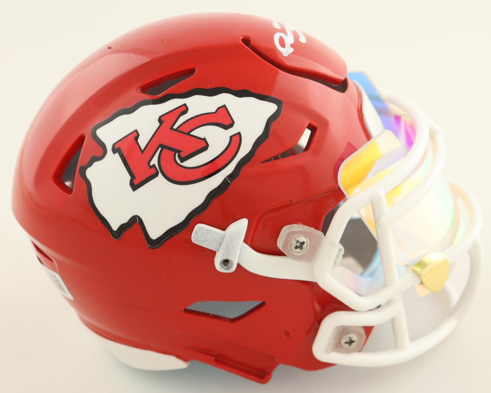 Riddell Kansas City Chiefs speed flex mini helmet with a visor has been hand-signed by Patrick Mahomes.