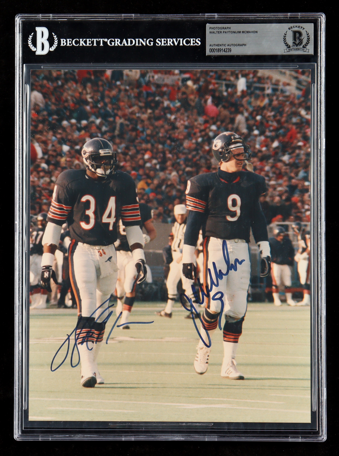 Photo measures 8" x 10" in size and has been hand signed by Walter Payton (D. 1999, Chicago Bears, HOF) and Jim McMahon (Chicago Bears).