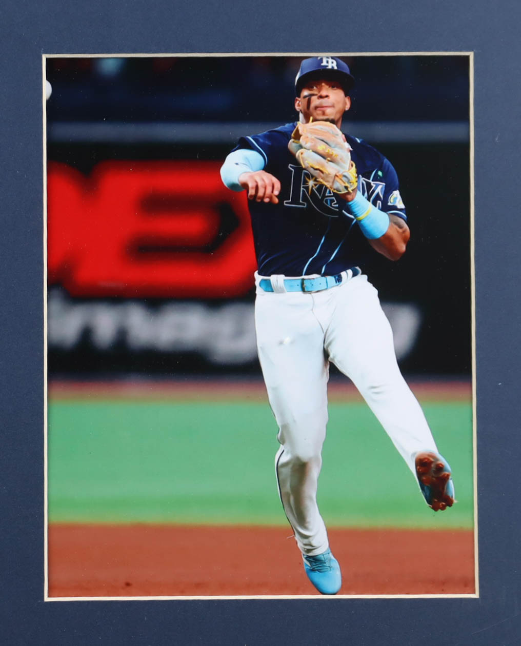 Custom Frame measures 35" x 43" in size and features a jersey hand-signed by Wander Franco. Please note that the 8" x 10" photos may be in reverse order.