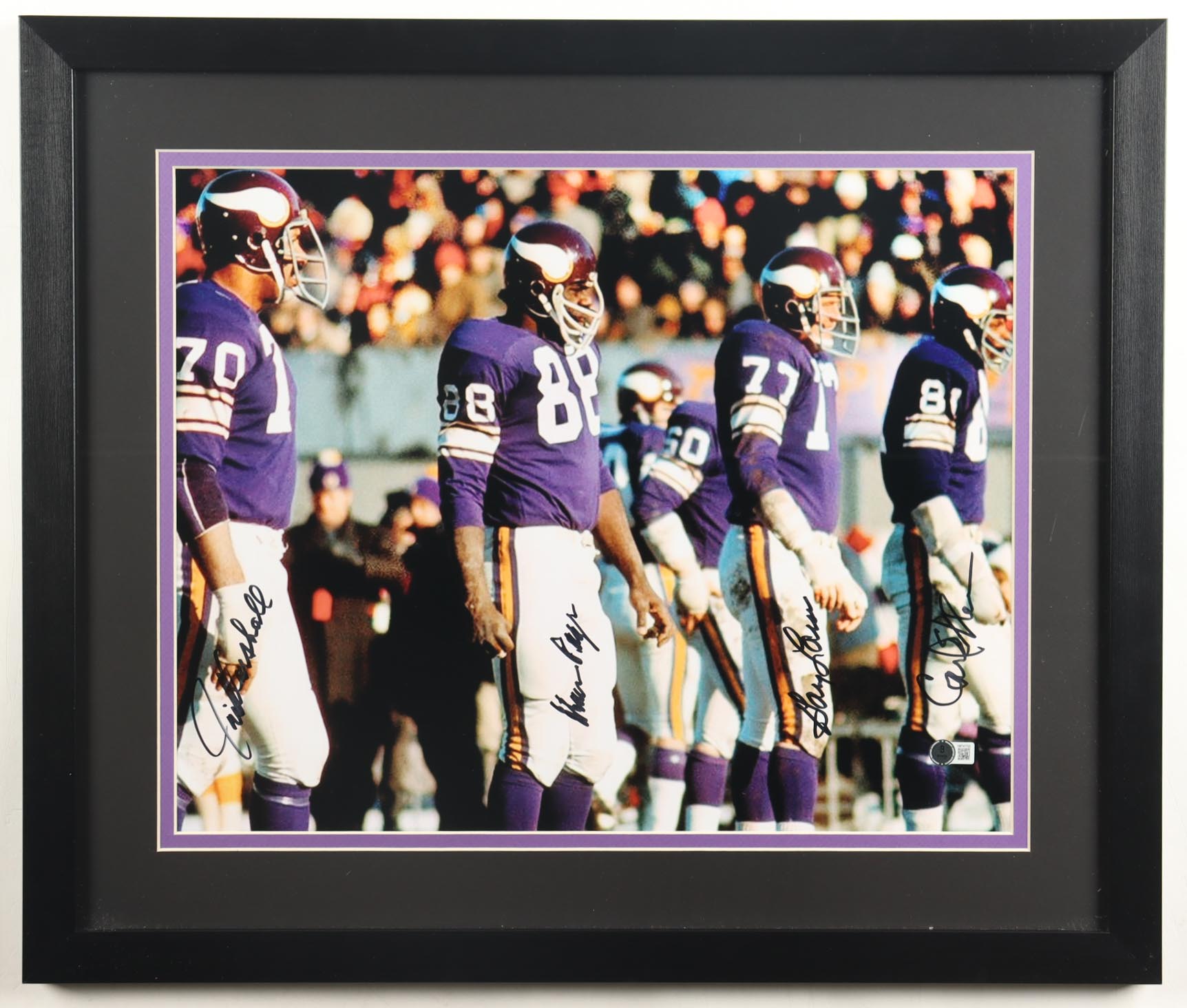 Custom frame measures approximately 22" x 26" in size and features a photo that has been hand-signed by Carl Eller, Jim Marshall, Gary Larsen and Alan Page.