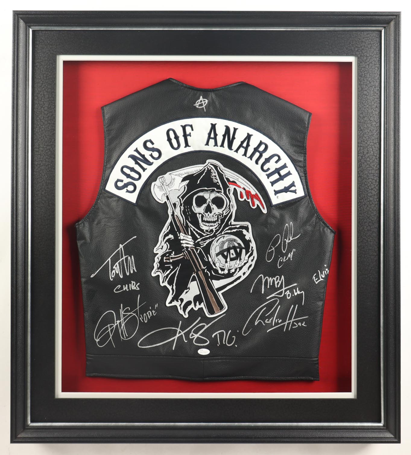 Custom frame measures approximately 32" x 36" in size and features a vest that has been hand-signed and inscribed by Charlie Hunnam (Jax Teller), Kim Coates (Tig Trager), Tommy Flanagan (Chibs Telford), Ryan Hurst (Opie Winston), Ron Perlman (Clay Morrow), and Mark Boone Junior (Bobby Munson).