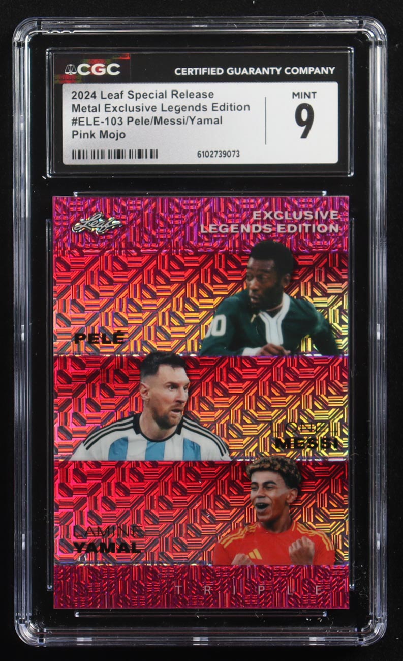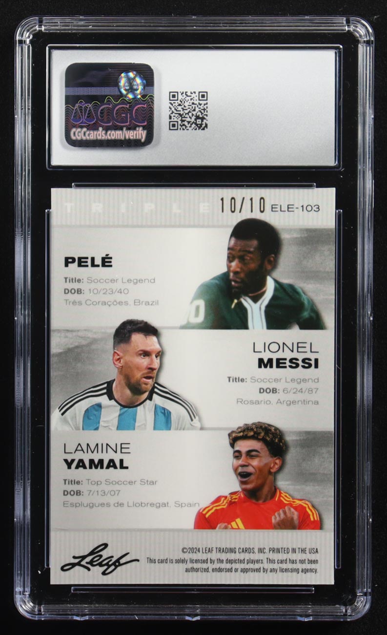 Pele / Lionel Messi / Lamine Yamal 2024 Leaf Special Release Metal Exclusive Legends Edition Pink Mojo Triple #ELE-103 #10/10 (CGC 9)