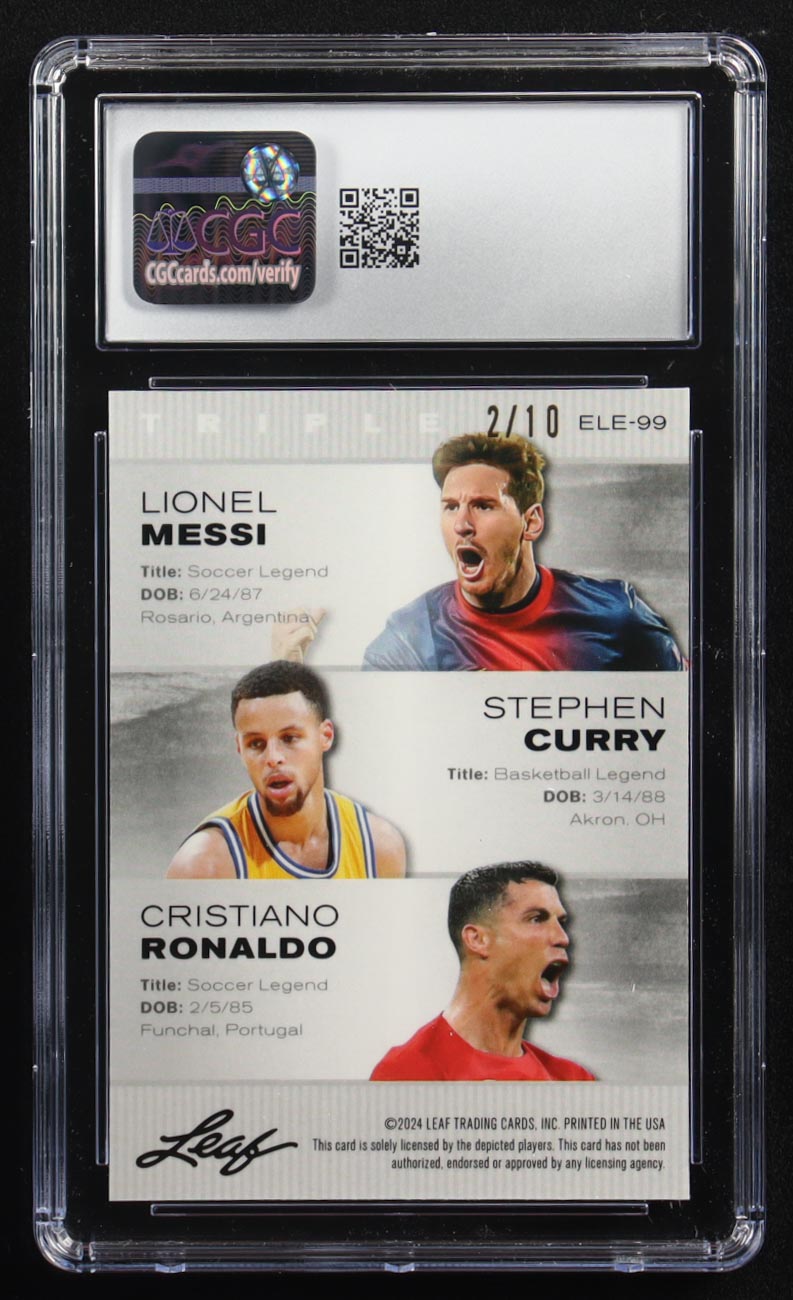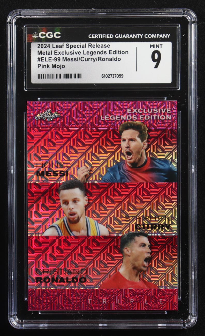 Stephen Curry / Lionel Messi / Cristiano Ronaldo 2024 Leaf Special Release Metal Exclusive Legends Edition Pink Mojo Triple #ELE-99 #2/10 (CGC 9)