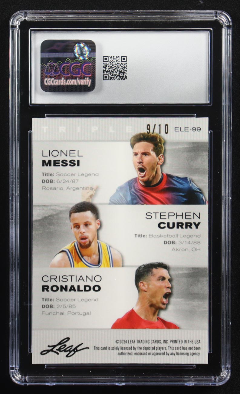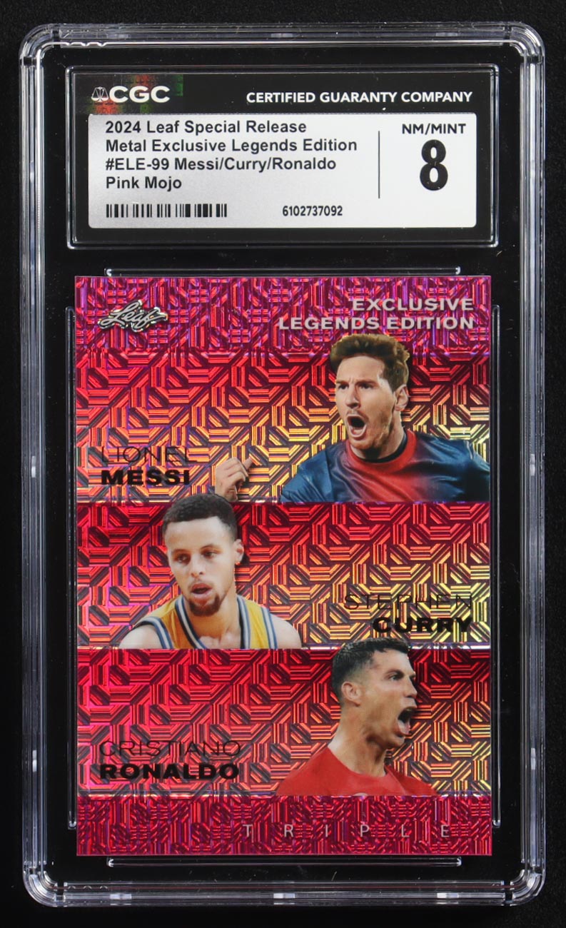 Stephen Curry / Lionel Messi / Cristiano Ronaldo 2024 Leaf Special Release Metal Exclusive Legends Edition Pink Mojo Triple #ELE-99 #9/10 (CGC 8)