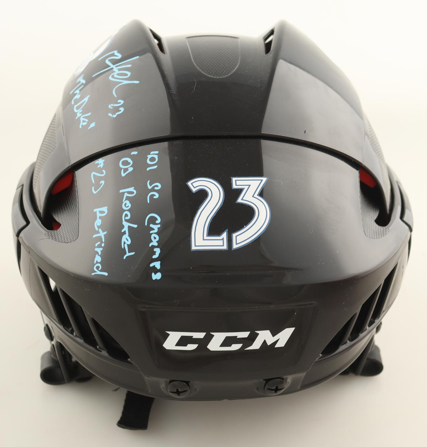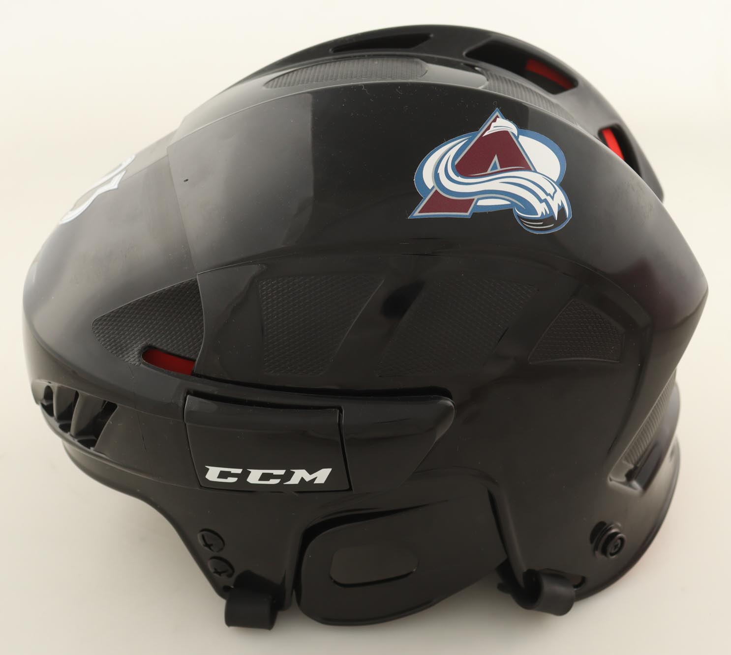 CCM Colorado Avalanche full-size authentic on-ice hockey helmet has been hand-signed and inscribed by Milan Hejduk.