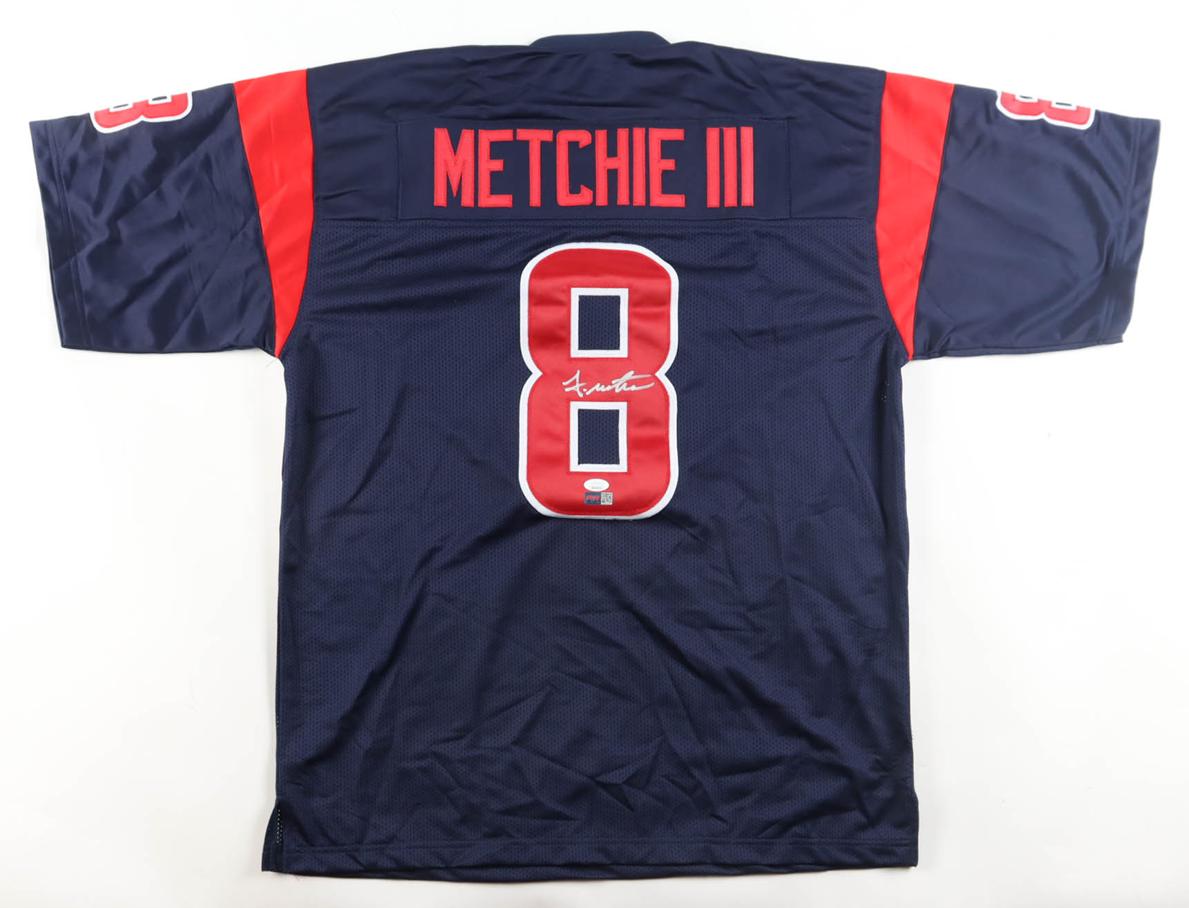 Custom jersey with everything sewn on, size XL. Hand-signed by John Metchie III.