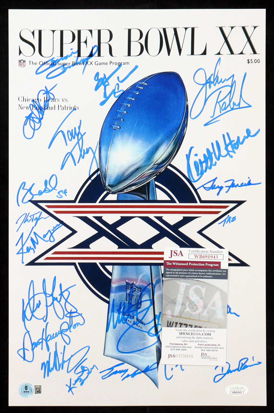 1985 Bears Super Bowl XX 11x17 Photo Team-Signed By (21) with Dan Hampton, Mike Singletary, Tom Thayer, Matt Suhey (Beckett & JSA)
