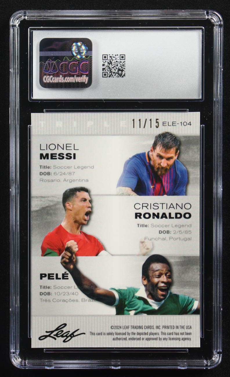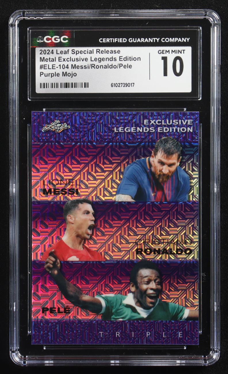 Pele / Lionel Messi / Cristiano Ronaldo 2024 Leaf Special Release Metal Exclusive Legends Edition Purple Mojo Triple #ELE-104 #11/15 (CGC 10)