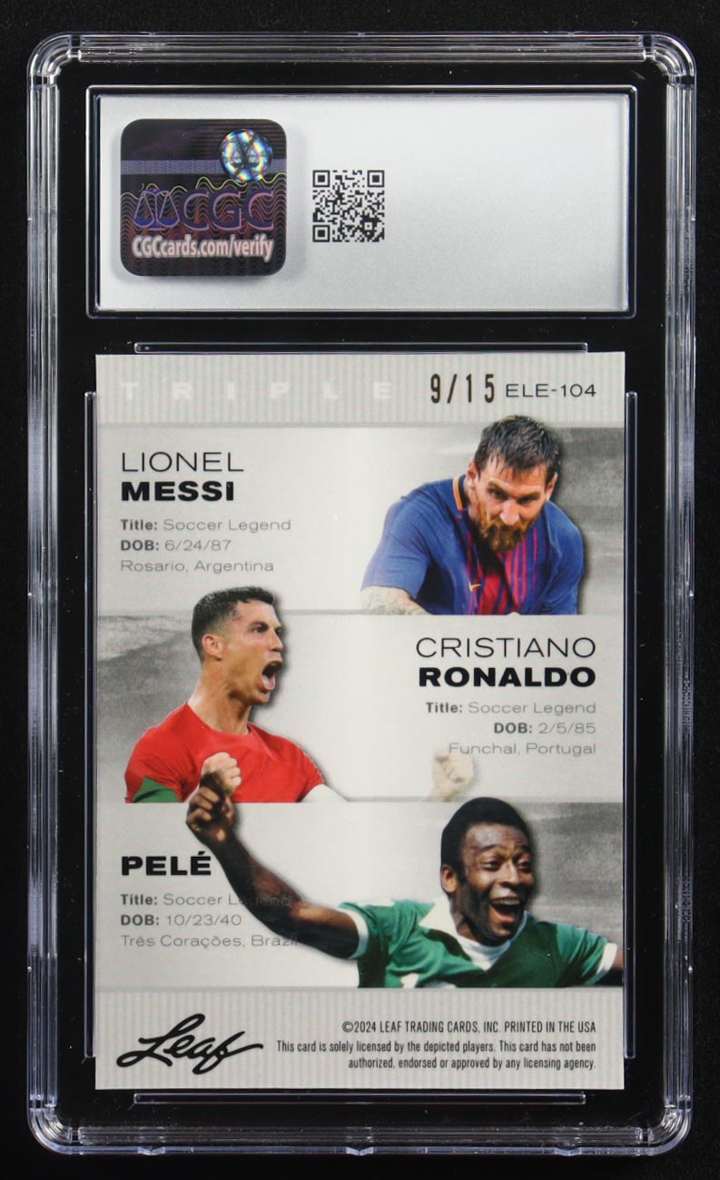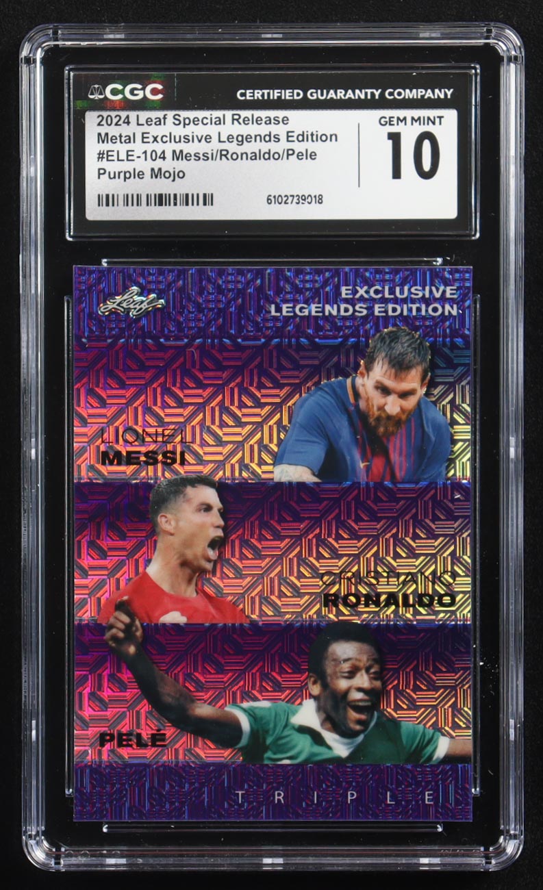 Pele / Lionel Messi / Cristiano Ronaldo 2024 Leaf Special Release Metal Exclusive Legends Edition Purple Mojo Triple #ELE-104 #9/15 (CGC 10)