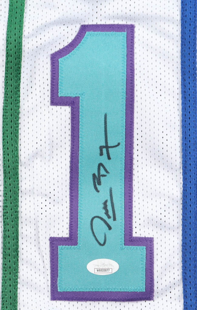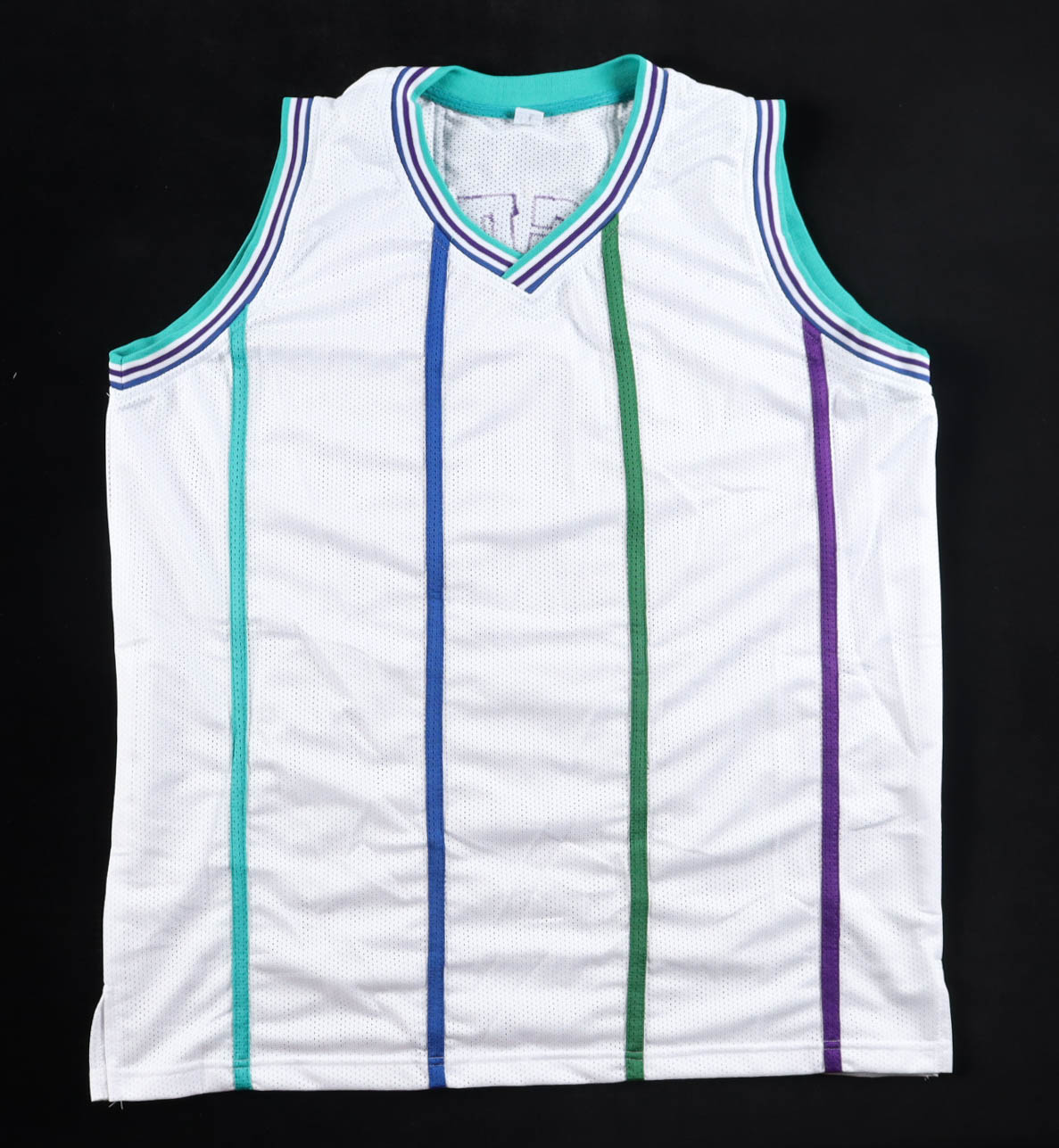Custom jersey with everything sewn on, size XL. Hand-signed by Muggsy Bogues.