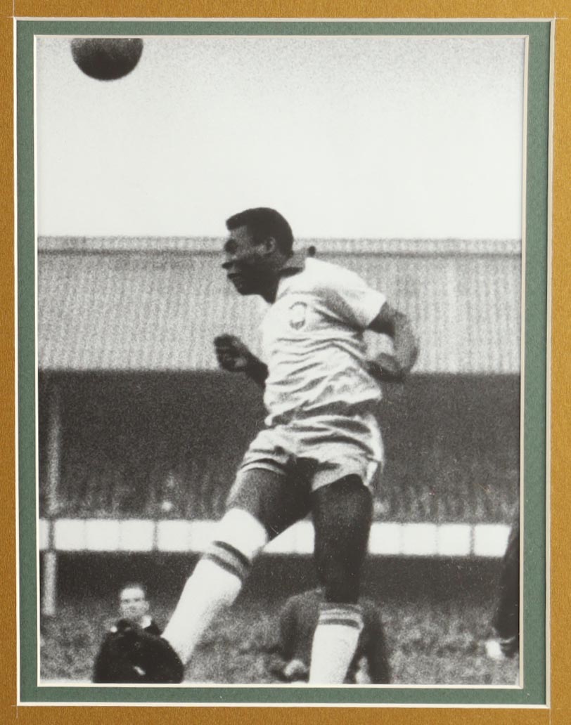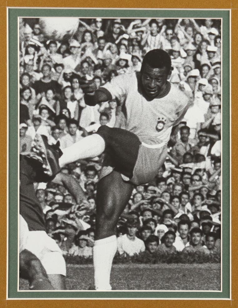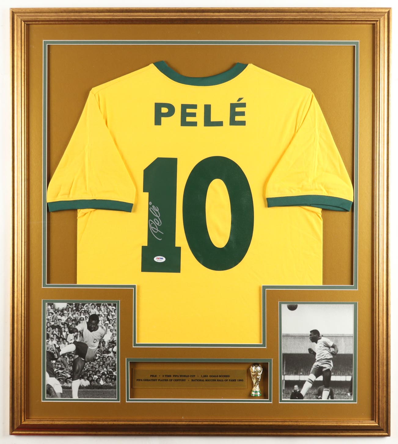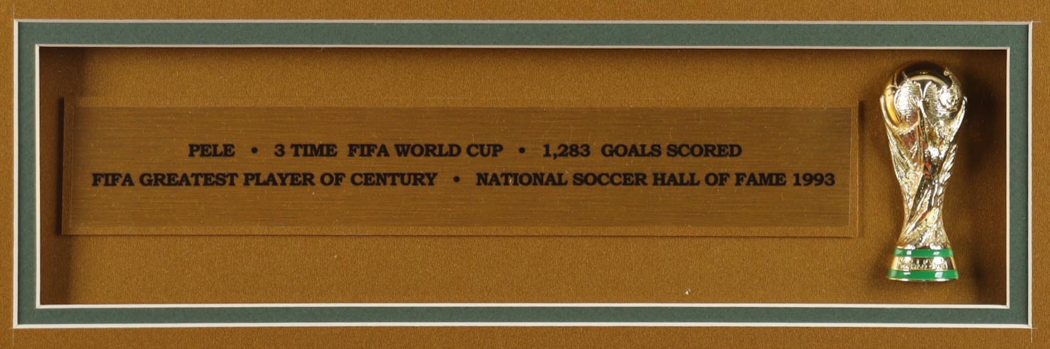 Custom frame measures 35" x 43" in size and features a jersey hand-signed by Pele (D. 2022, HOF). Please note that the 8" x 10" photos may be in reverse order. Display also features a World Cup Trophy Pin.
