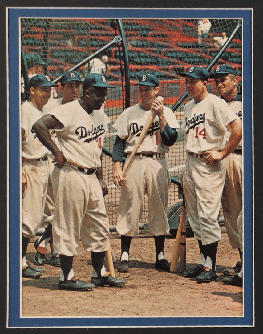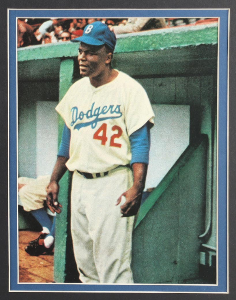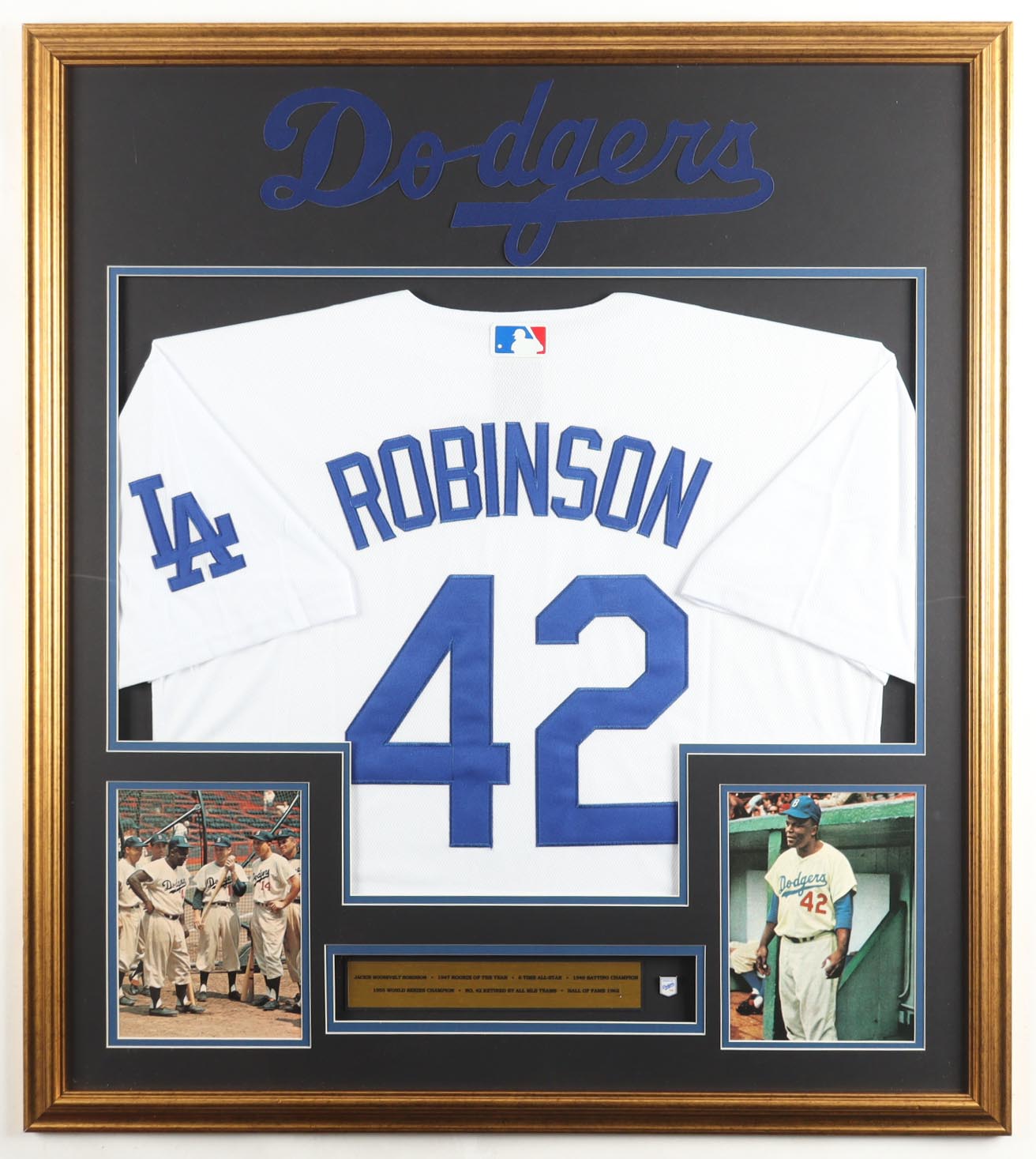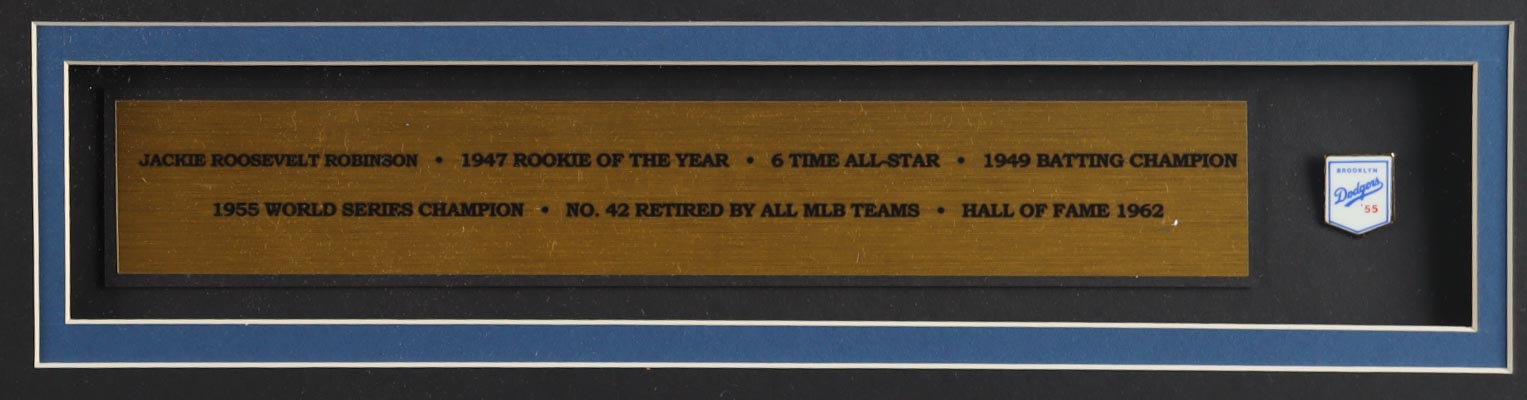 Custom frame display measures approximately 32" x 36" in size and features a jersey of Jackie Robinson. The display also includes a Brooklyn Dodgers Logo pin, (2) 8" x 10" photos, a giant cloth team logo patch and a custom career statistics plaque. Please note that the item is unsigned.